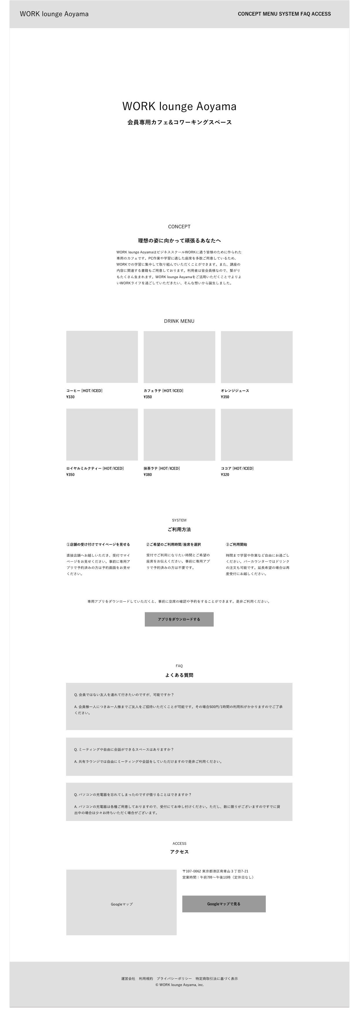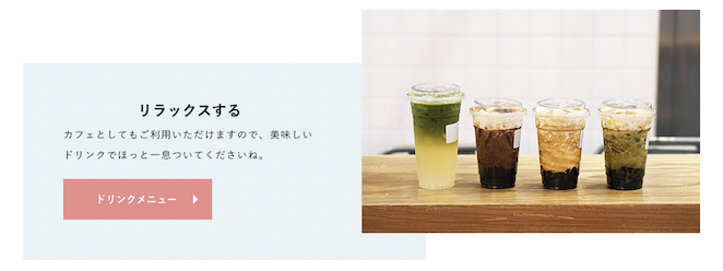 ・ドリンクメニューのポップアップ化 "WORK lounge Aoyama"の特徴と設定したペルソナの行動・ニーズを加味した際に、ドリンクメニューは「コワーキングスペースを利用してもらう」というゴール設定において補助的な役割であると考えました。そのため、「特徴」内にボタンを配置し、ポップアップ画面で表示するように変更しました。