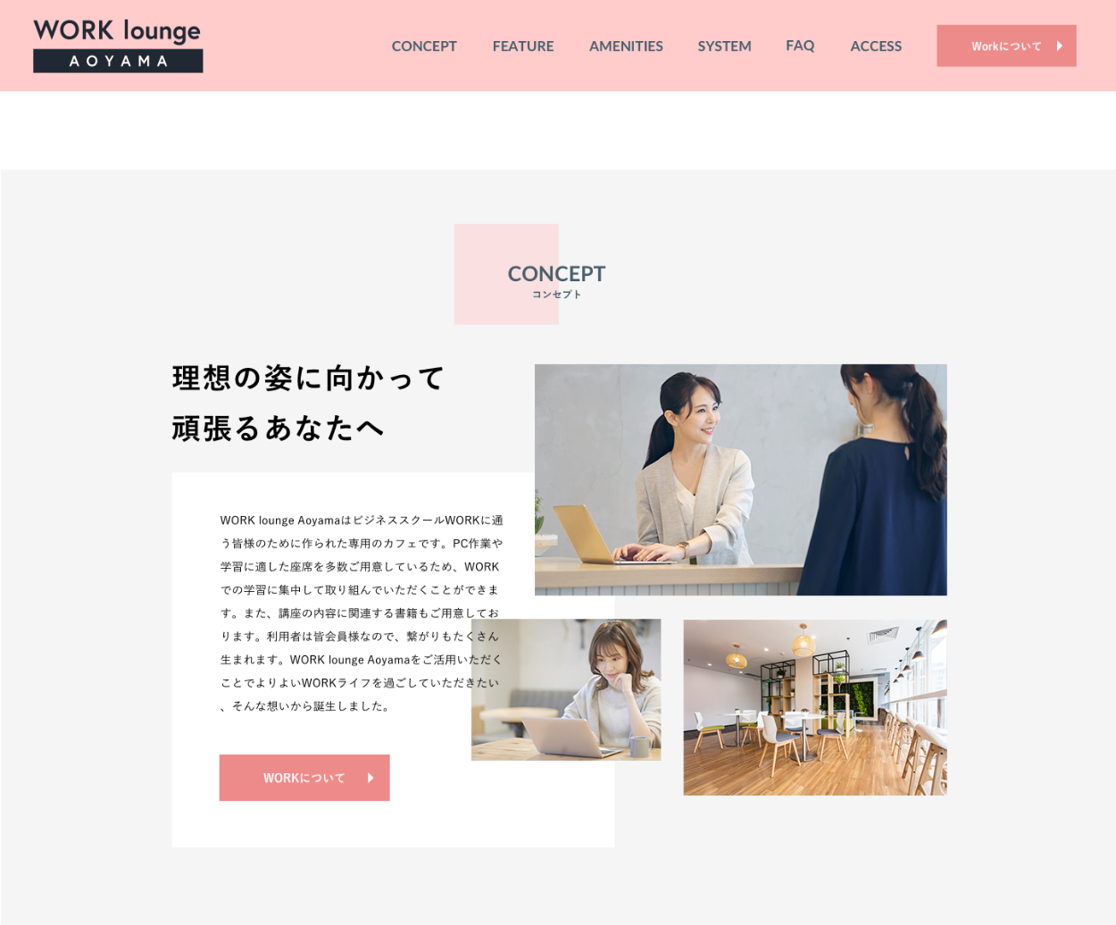 〈WORKが気になっている非会員〉 ・まずはWORKについて詳しく知ってもらい、より興味を持ってもらう ・WORKのページへ誘導する ⇨ヘッダーとコンセプト内にWORKへ誘導するボタンを配置