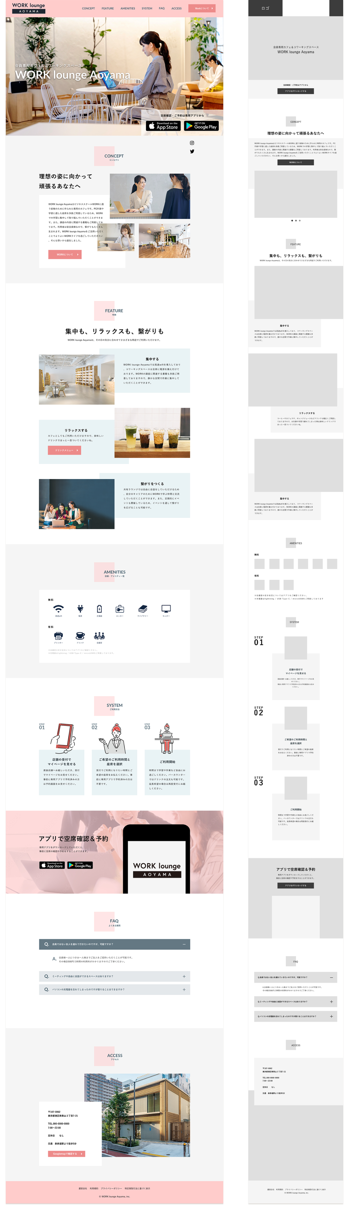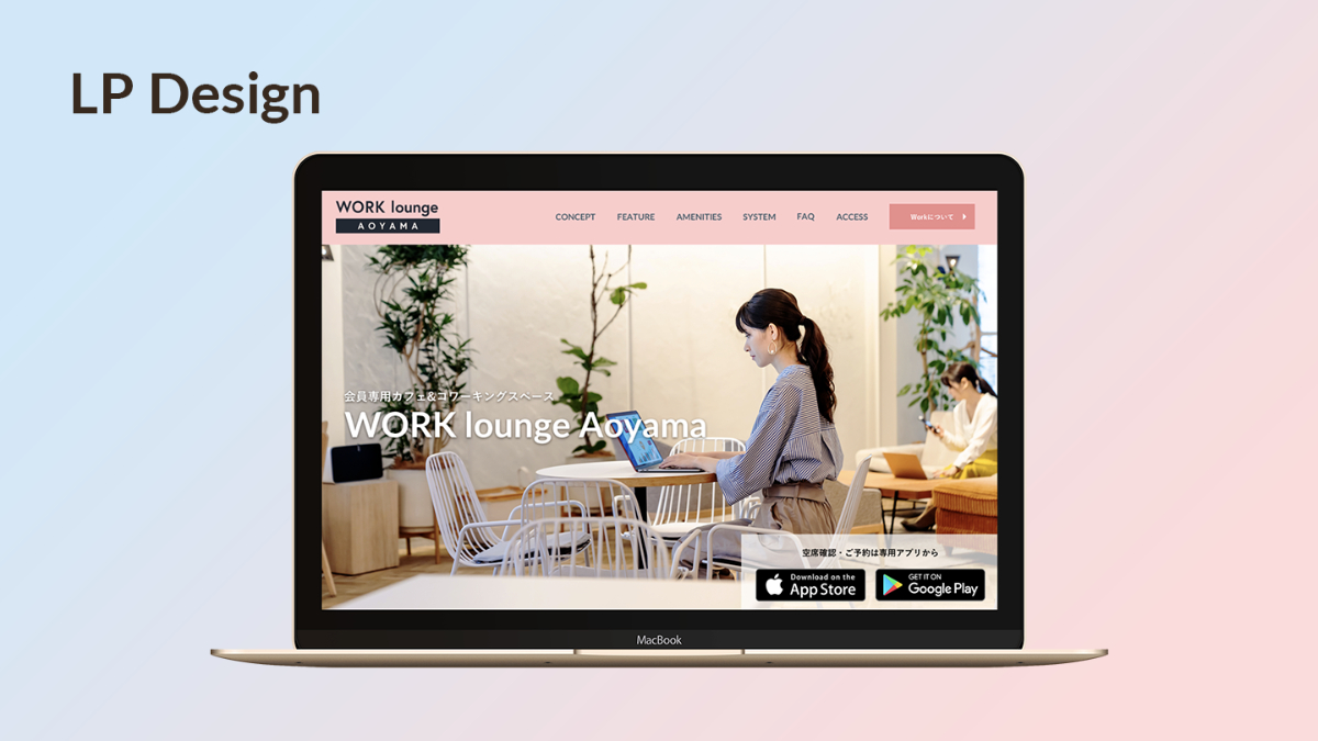 今回はターゲットがビジネススクールの会員/非会員の両方だっため、それぞれに合わせたゴールの設定と情報設計、デザインを行いました。 〈WORKの会員〉 ・コワーキングスペースを利用してもらう ・予約専用アプリをダウンロードしてもらう ⇨MVへアプリのダウンロードボタンを配置、CTAの背景に写真を配置して目立たせる