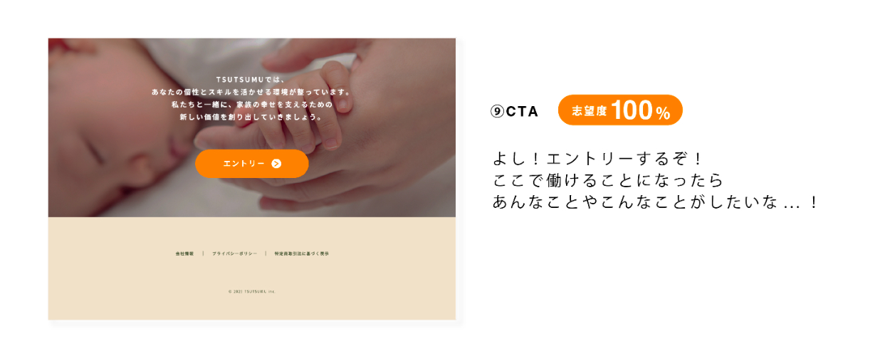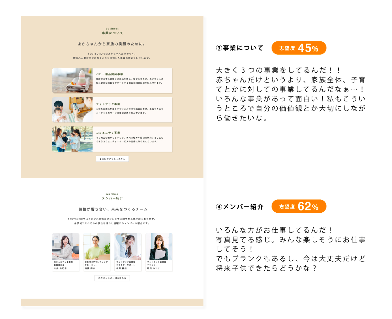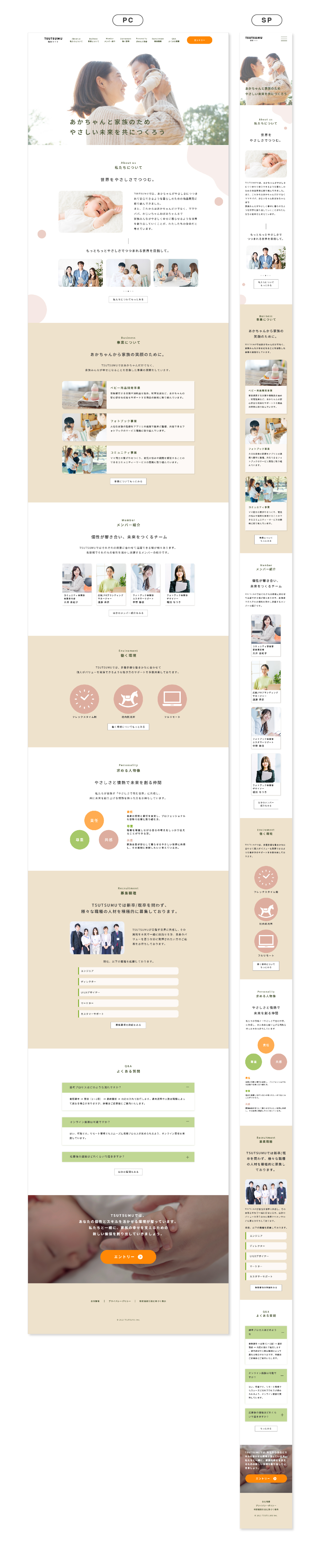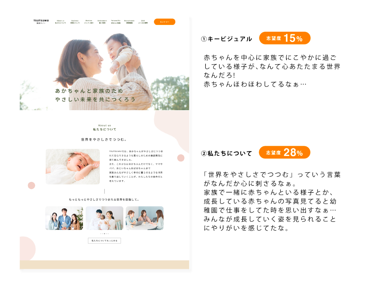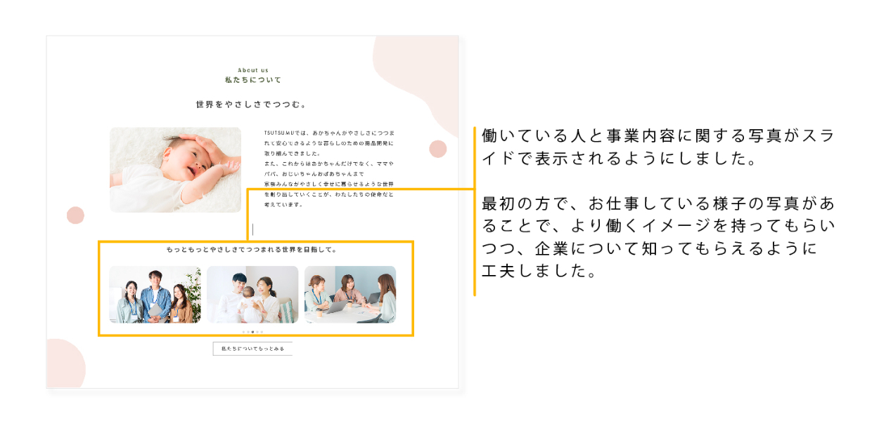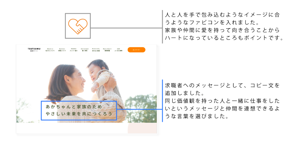 家族や赤ちゃんを笑顔にする写真だけでなく、採用サイトという観点から求職者へアピールできるコピー文を加え、より興味を持ってもらえるようにしました。