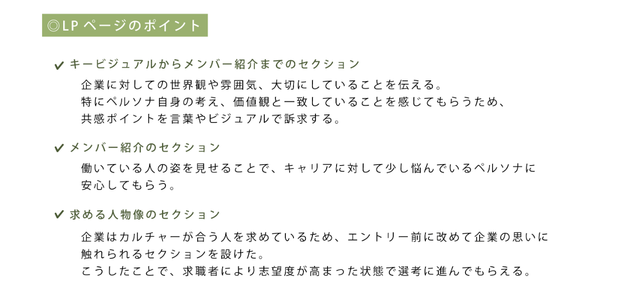 LPを通してエントリーをしてもらうこと(採用強化のためできるだけたくさんの応募がきて欲しいが、エントリーがあれば誰でもいいわけではなく、カルチャーフィットする方に応募してもらいたい)