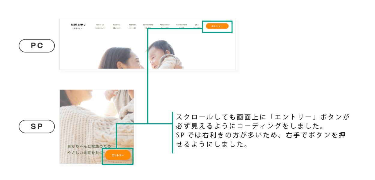 PC表示の時はヘッダー部分を固定することで、エントリーボタンが画面上に、SP表示の時は、「エントリー」ボタンが画面の右下に固定して表示されるよう、コーディングを行いました。