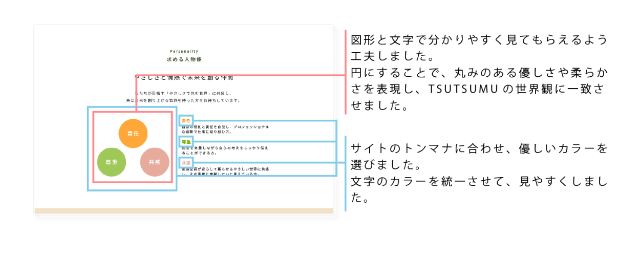 また求職者の方にとっても未来に向けた成長をやさしく、明るい気持ちでここなら仕事ができそうと思ってもらいたいなという意図で、デザインを考えました。