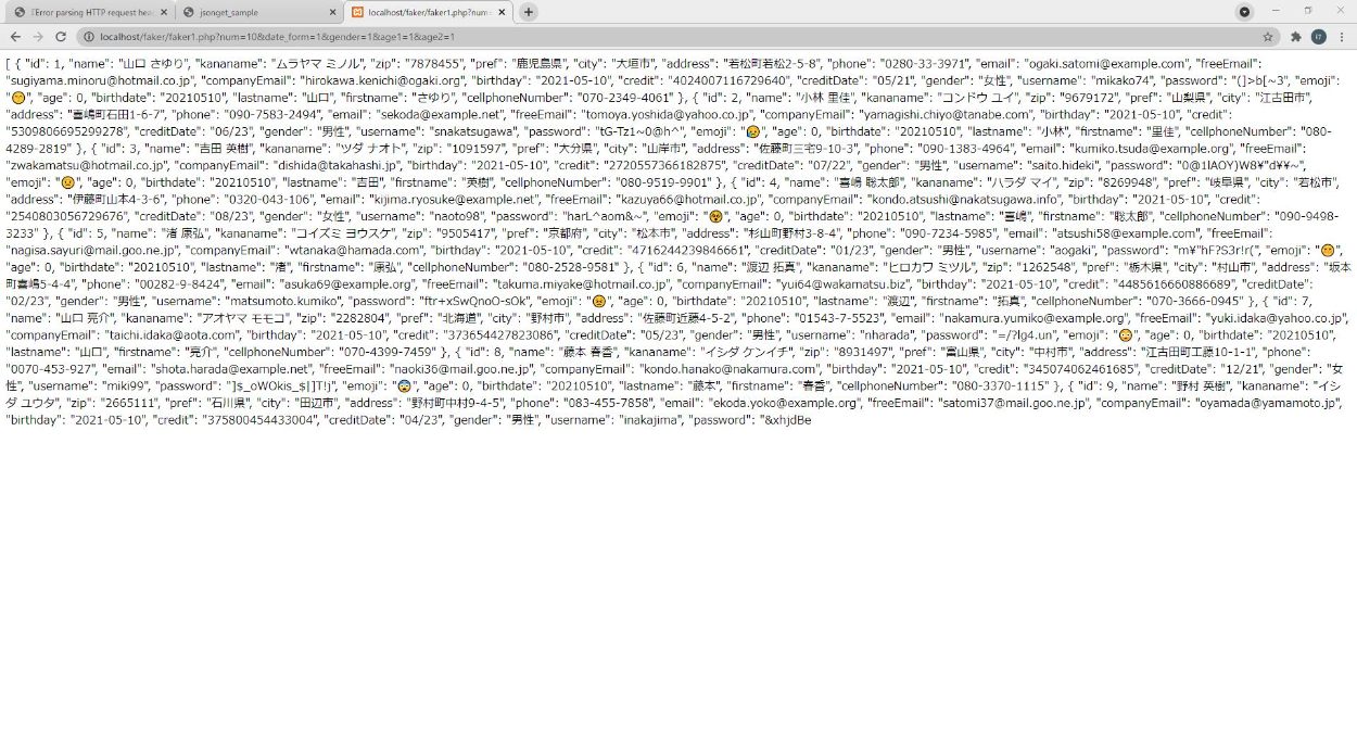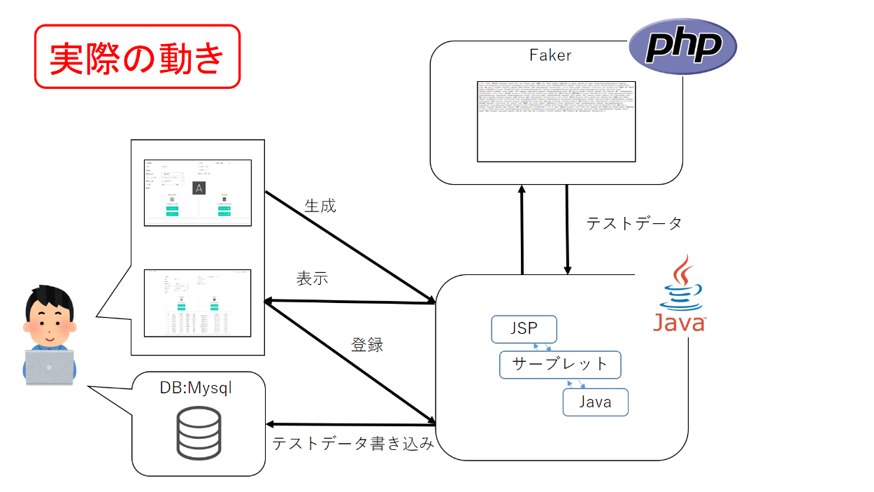 ・テストデータはPHPのライブラリであるFakerを使用して、生成します。