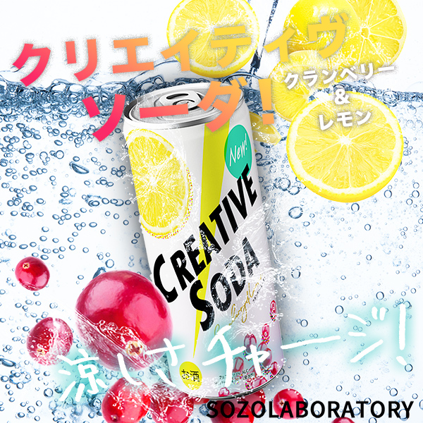 背景に炭酸のイメージ画像を使用し、清涼感・爽快感が視覚的に伝わるよう表現