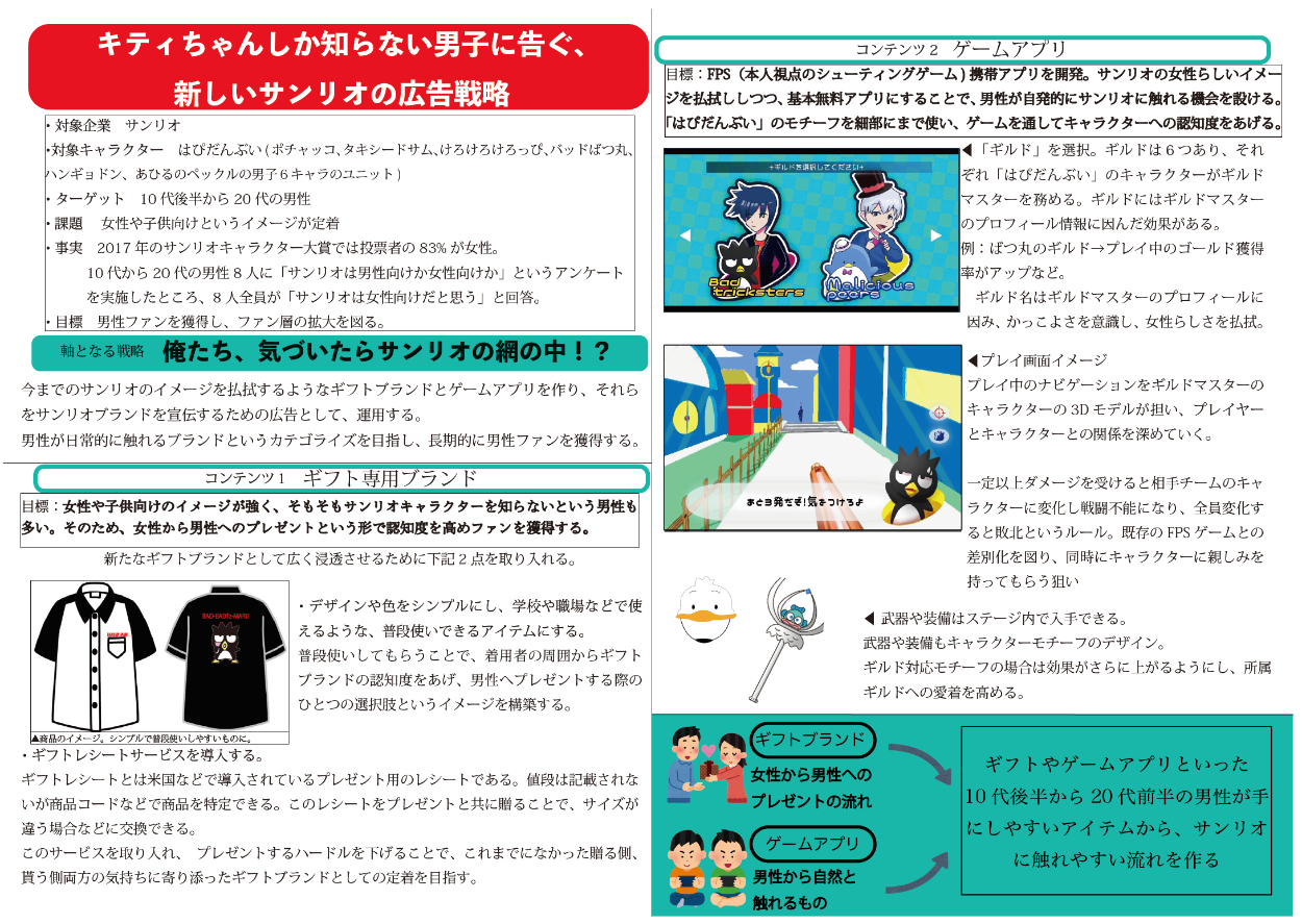 「特定の企業やブランドを1 つ取り上げ、市場拡⼤のための企画を考える」というテーマで、サンリオを対象の企業としました。サンリオは女性向けだと思い、市場拡大のため、男性をターゲットにし、男性からの親近感を得るため、対象のキャラクターを、男の子キャラクターが結成された”はぴだんぶい”にしました。