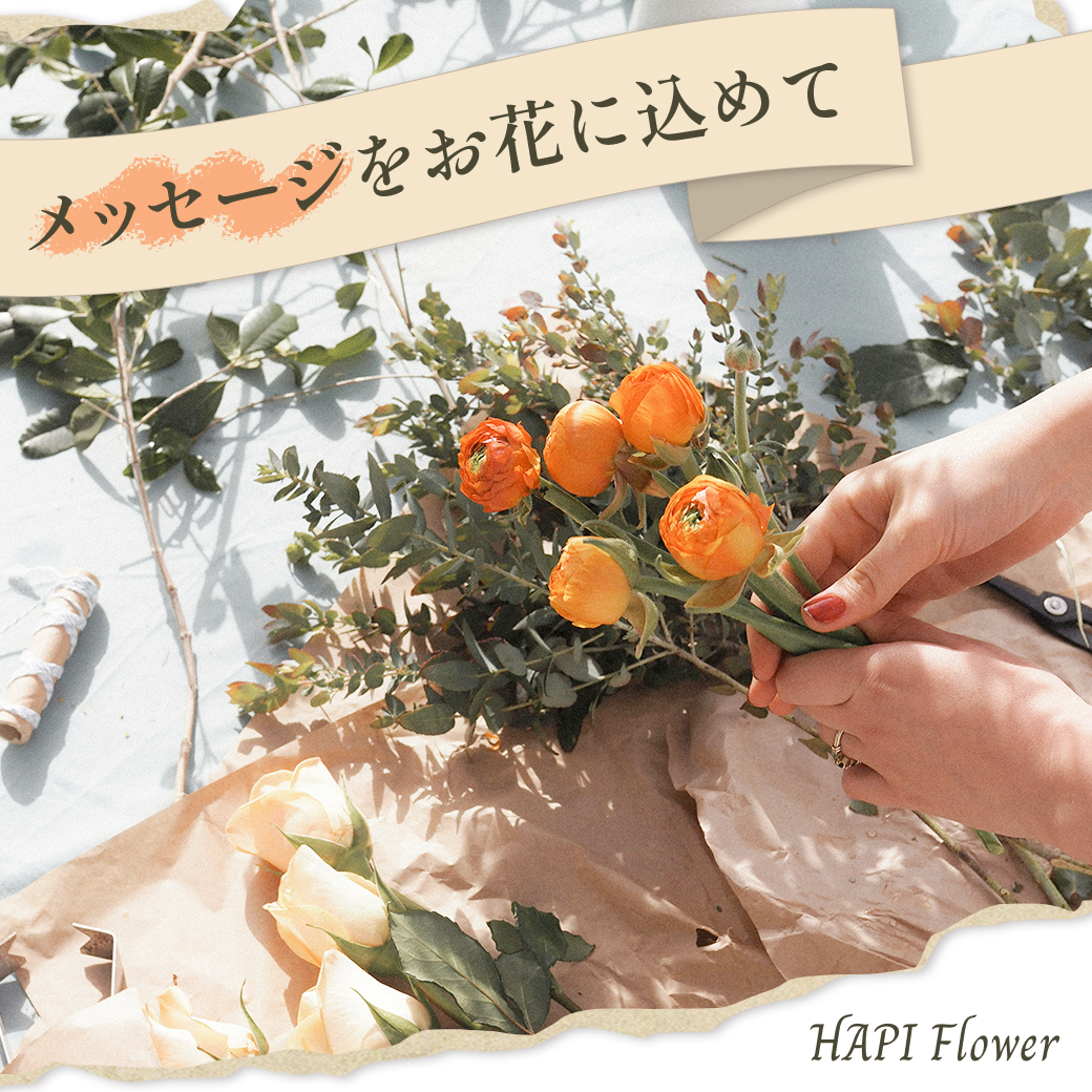 ①「メッセージをお花に込めて」のコピーを選び、『選んだお花そのものがメッセージカード』というイメージでバナーを作成しました。