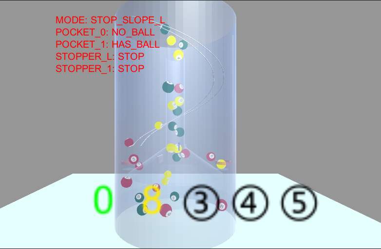 0~9が描かれた赤・緑・黄のボールを水力で上に吹き上げ、落ちてくる最中にレーンに乗ったボールがポケットに入ることで抽選を行う。