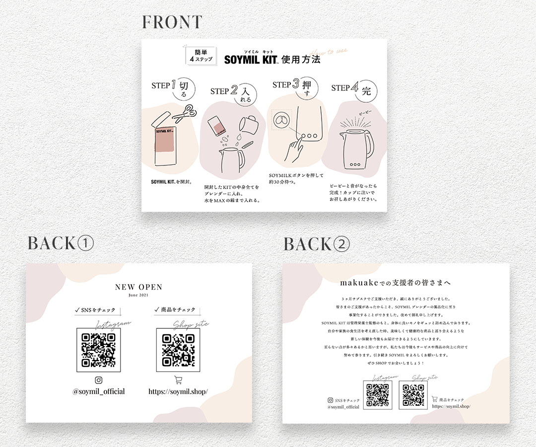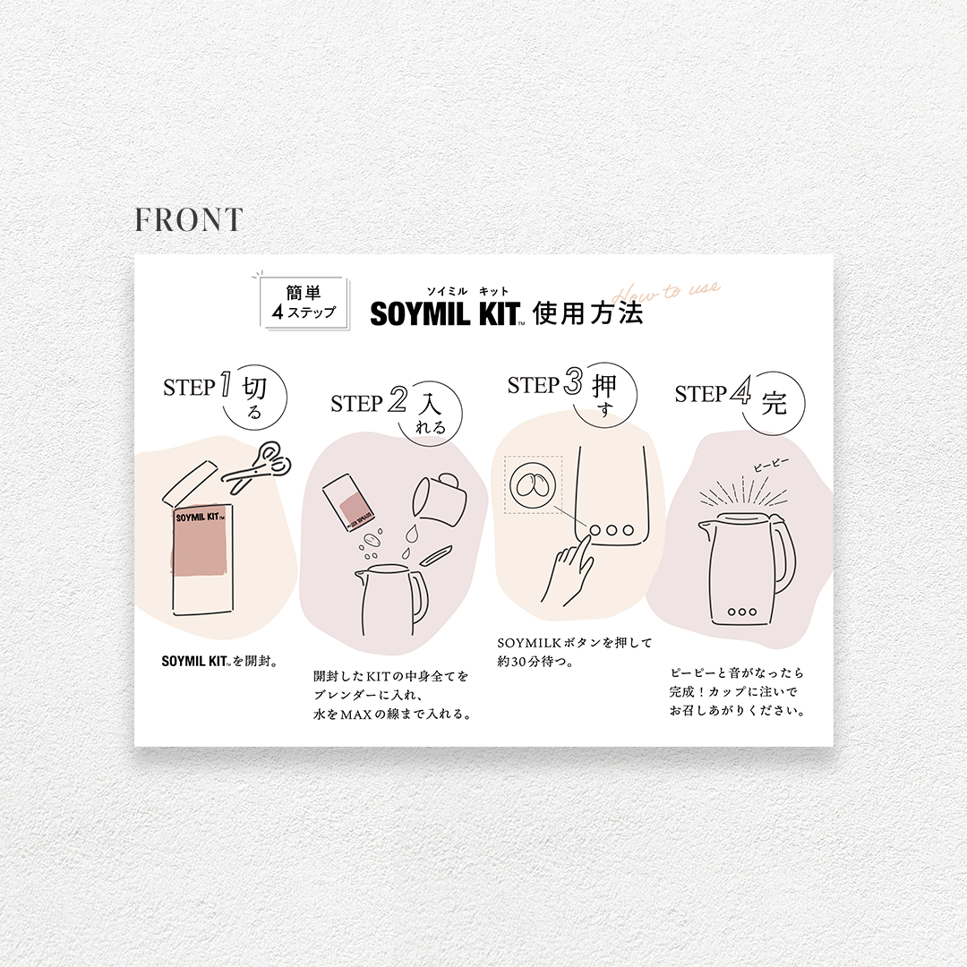 豆乳ブレンダーとキットを販売する企業様。一般販売にてご購入された方、クラウドファンディングにてご支援された方それぞれに、プロダクトと同封する説明書を制作いたしました。