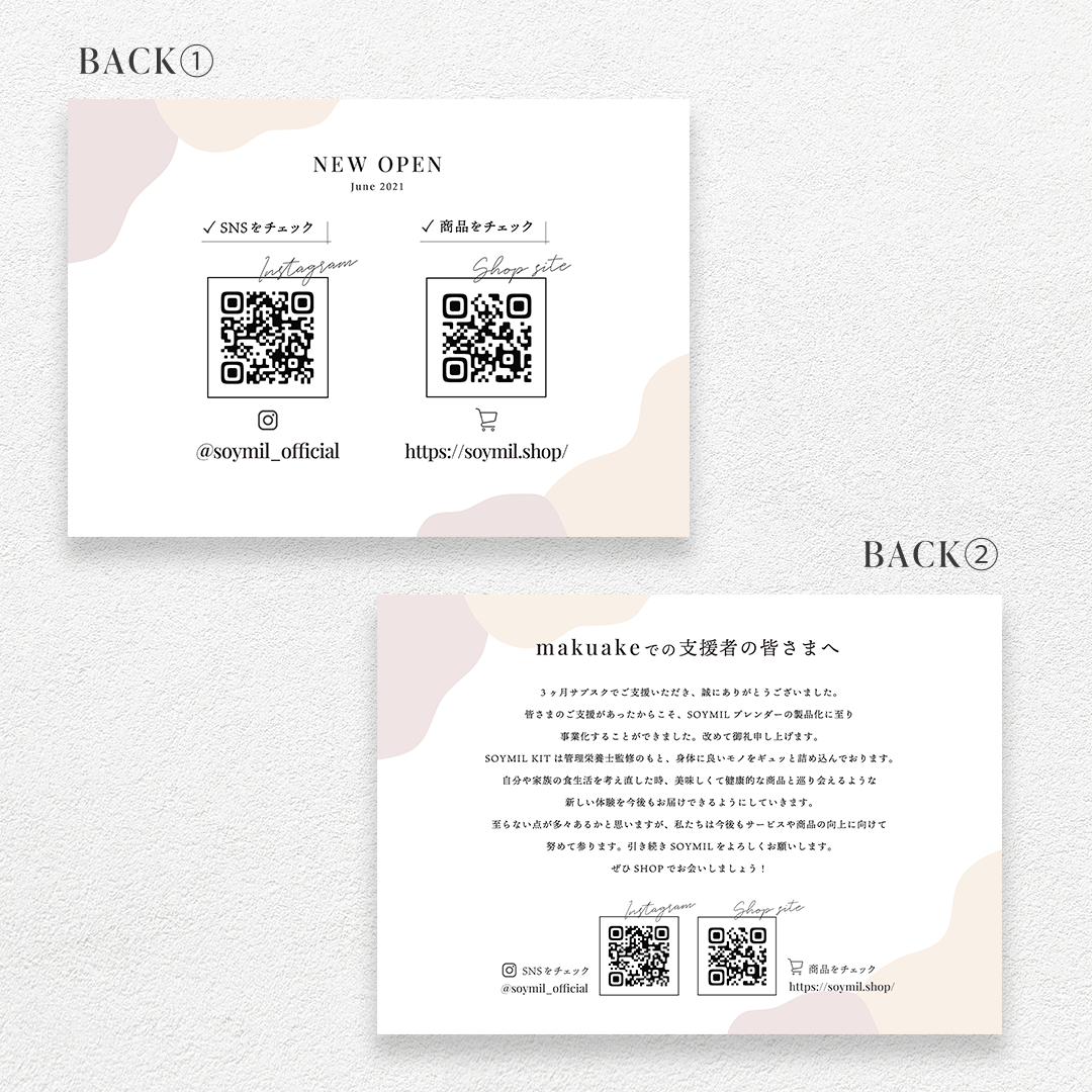 ・両面カラー (上段: 表面、下段: 裏面 - ①一般販売向け ②makuakeでの支援者向け)