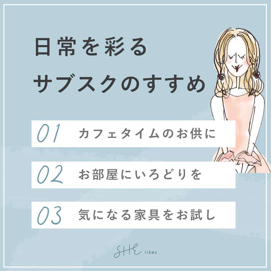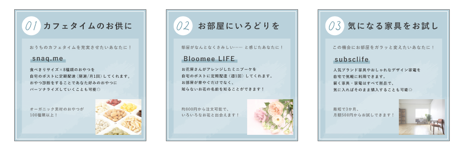 ・サブスクリプションサービスといえば音楽や動画が有名ですが、より「おうち時間」にフォーカスしたサービスを紹介したいと考え、「お菓子」「花」「家具家電」の3つのサブスクリプションサービスを題材としました。