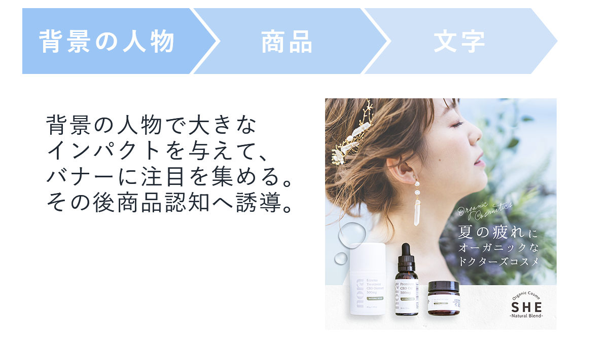 SNSバナーということで、写真のインパクトで注目してもらえるように人物の素材を大きく使用しています。また、商品認知を目的としている為、商品についても全体の1/3程の大きさで配置しました。