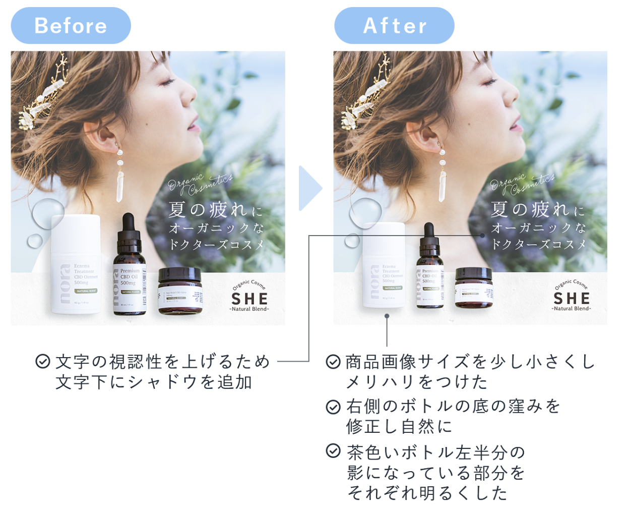 商品画像の影になっている部分だけを明るく調節したことで、バナーとしての統一感がでたと感じました。また、文字下のシャドウを追加することで、文字の視認性も上がりました。これからも、小さなことにも手を抜かず、細部までこだわってクオリティの高いデザインを目指します。