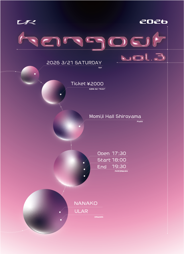 地元ダンスイベント「HANGOUT vol.3」のメインビジュアルポスターを制作。 未来感のある世界観と情報の整理を両立し、イベントの非日常性を視覚的に表現した。
