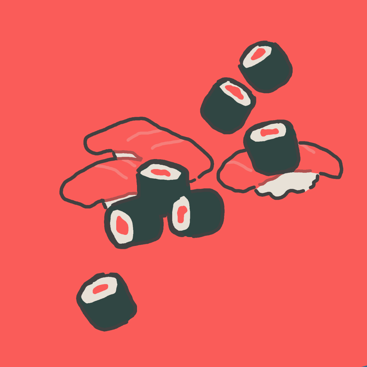 まぐろのすし な もうすぐ多分社会人 写真フォルダを見返していたら、寿司の写真を発見し、それを眺めていたらマグロが食べたくなってきたので絵に描きました。構図に関しては思い付きで、特に意味はありませんが、かなり不思議な感じになってしまいました。