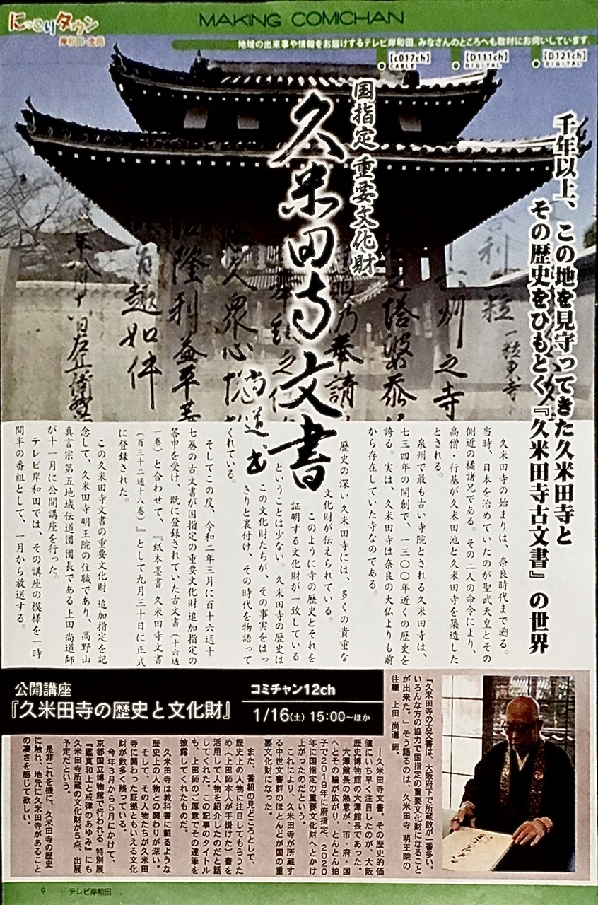 岸和田市の久米田寺が所蔵する古文書が国の重要文化財として追加登録を受け、それを記念する特別講座が行われました。しかし世間はコロナ禍に入っており、多くの希望者を集めることが叶わず、当企画を番組化することによってより多くの方々に見て知ってもらおうとしました。その時に講師としていらっしゃった久米田寺・明王院の副住職にお話を伺い、より噛み砕いた内容で紙面化した記事になります。