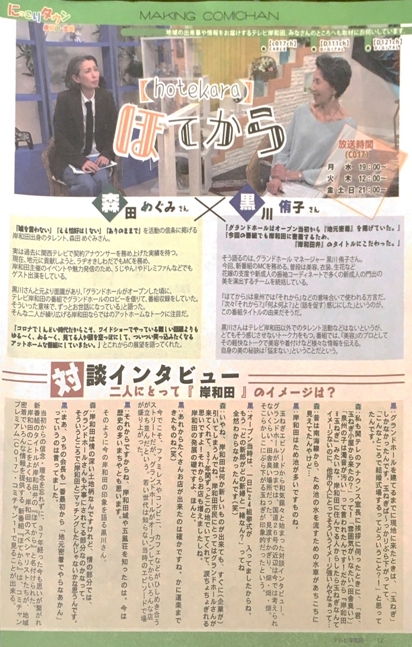 岸和田に所縁のある二人の女性をMCに迎えスタートした女性向け番組。その放送開始初月に、お二人を対談形式でインタビュー。二人の紹介を始め、二人にとっての岸和田のイメージやこれからの意気込みを語ってもらい、記事にしました。