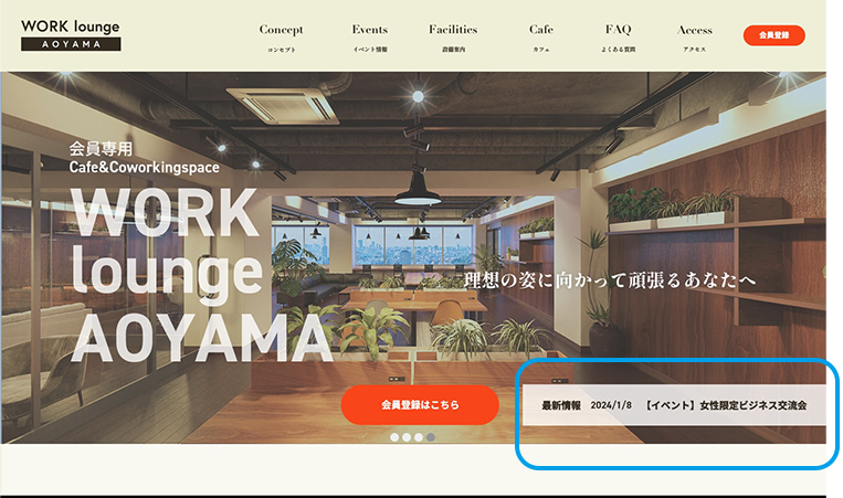 - 最新イベント情報をメインビジュアル下部に設置し、何度かサイトを訪れている方に更新情報があることをお知らせしています。