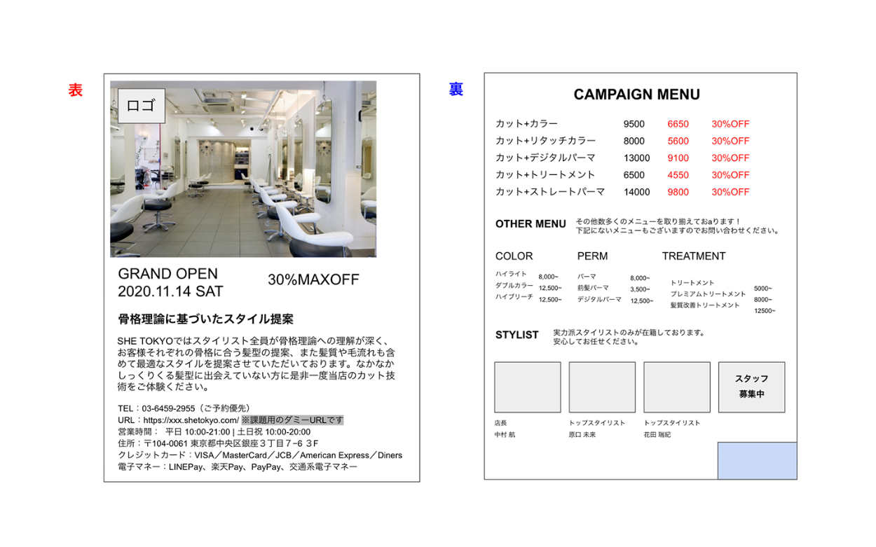 フライヤーはWEBページとは違い、表裏を見てもらわないといけないということを特に意識し、表面のファーストビューである写真でインパクトのあるものを使用し、それをみた方が興味を持ってもらい、その下に視線を誘導できるような設計にしました。