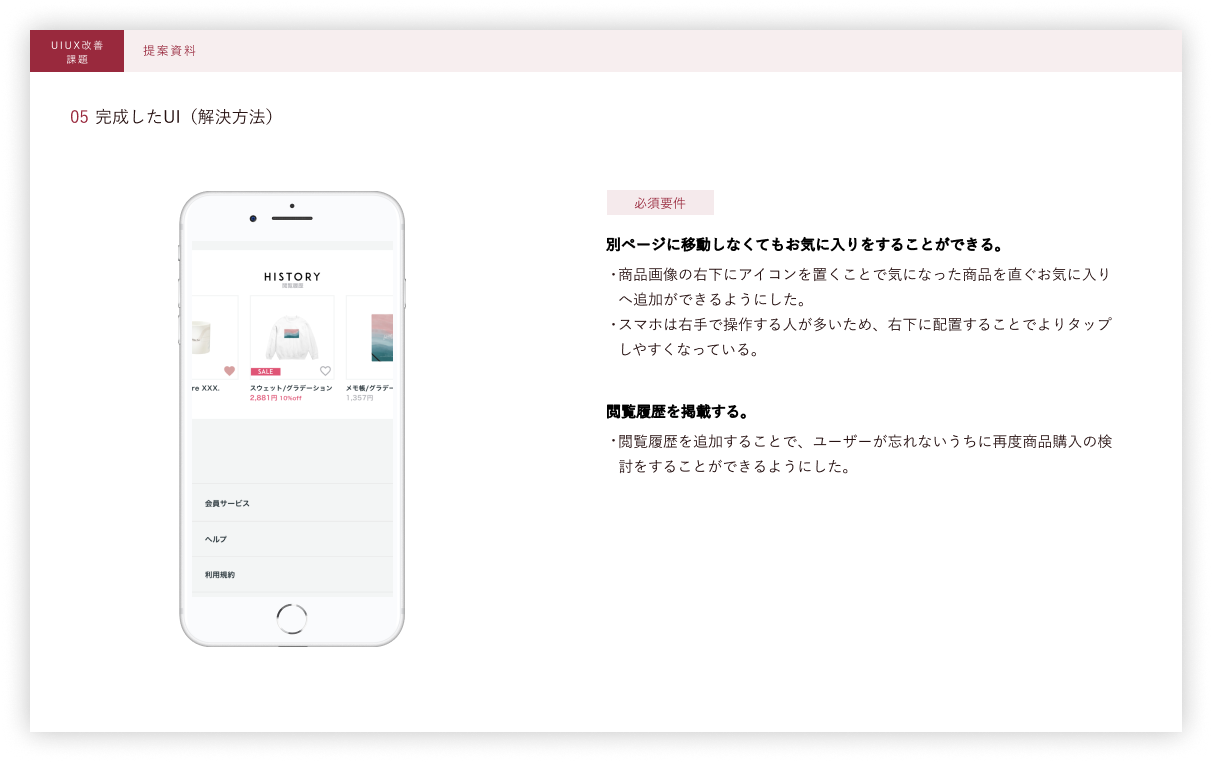 ・制作する中で他者のECサイトを見て共通事項を洗い出しました。なぜこの配置なのかどのような動線を想定しているのかを考えることでベースができ、スムーズな動作ができるUIが完成すると思いました。