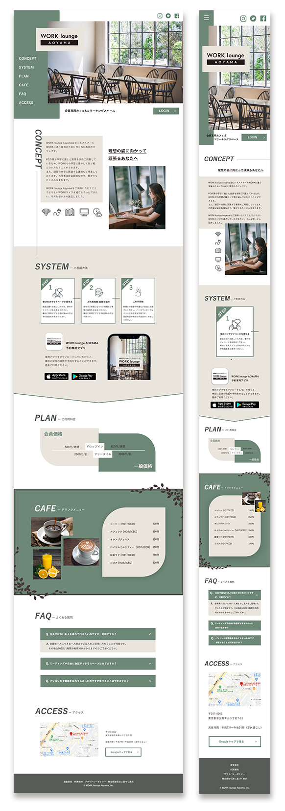 会員様限定のカフェ&コワーキングスペースをオープンすることとなりました。 利用方法やアクセス情報を載せたWebサイトを制作したいなと思っています。