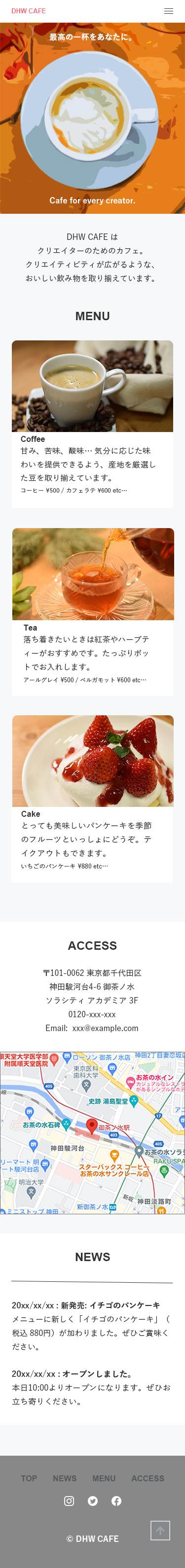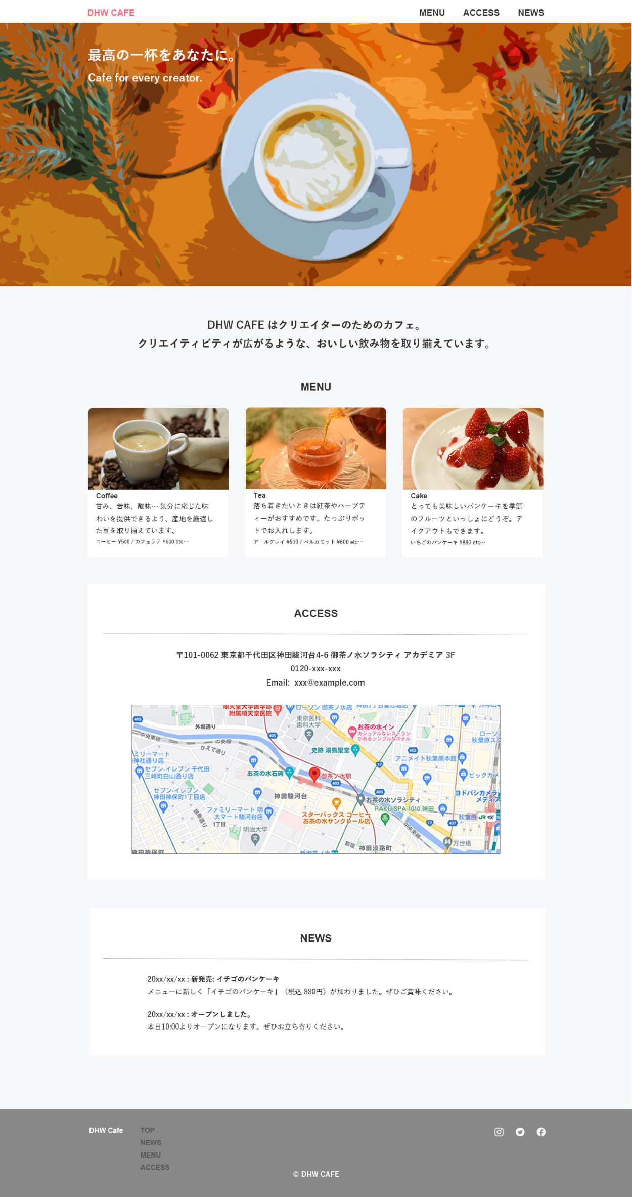 カフェのHP作成。(レスポンシブ対応) nao. WEBデザイン勉強中(転職活動中) OVERVIEW デジタルハリウッドの課題で作成しました。 実際のサイトはこちら URL:(サーバーの調子が悪いので修復中です。)