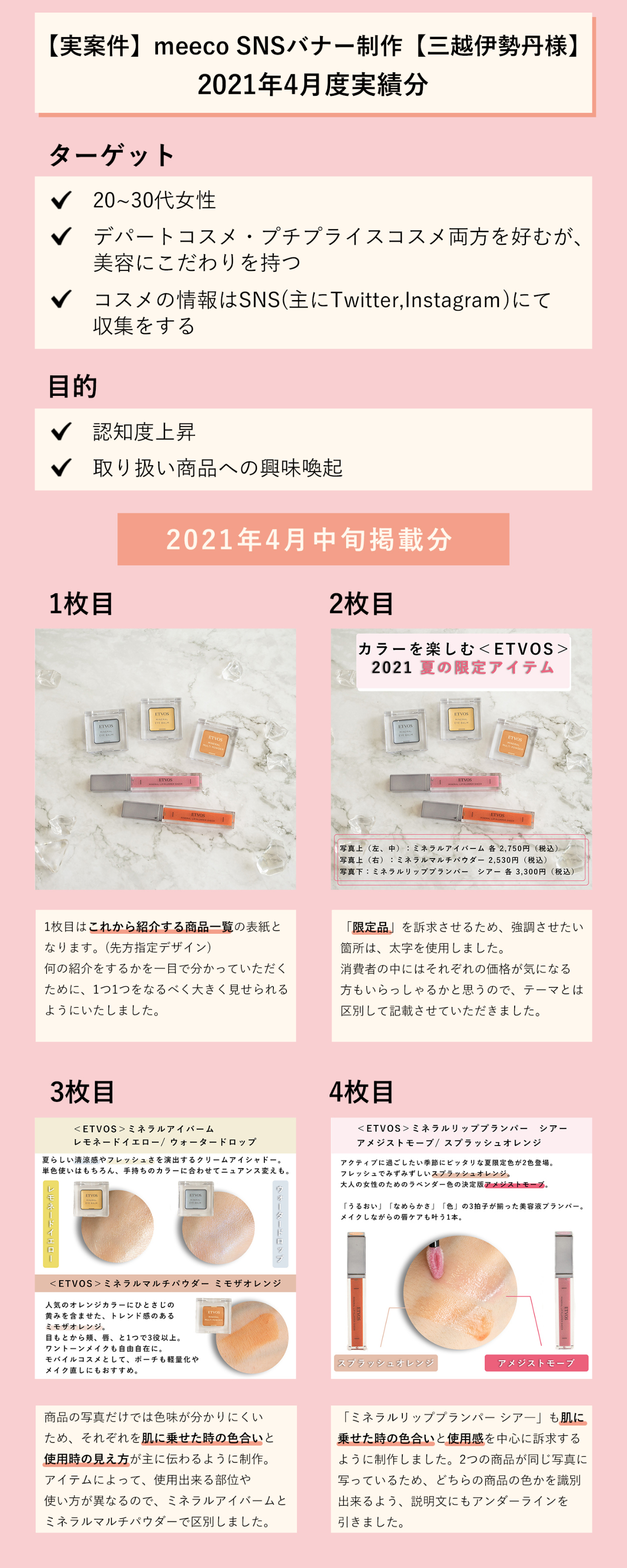 【実案件】 meeco SNSバナー【三越伊勢丹様】 Marino Koumoto Pharmacist/駆け出しWebデザイナー OVERVIEW 三越伊勢丹様 アカウント meeco SNSバナー 2021年4月度実績分になります。 使用ソフト: Adobe Photoshop 2021 YEAR 2021 - 2021