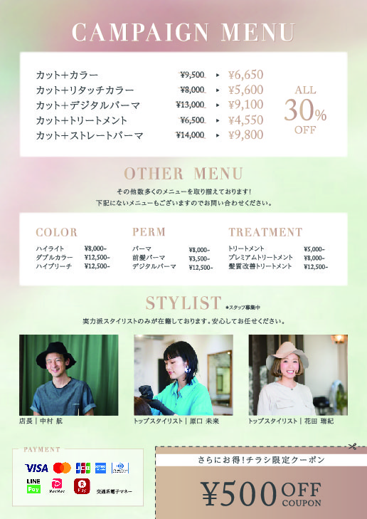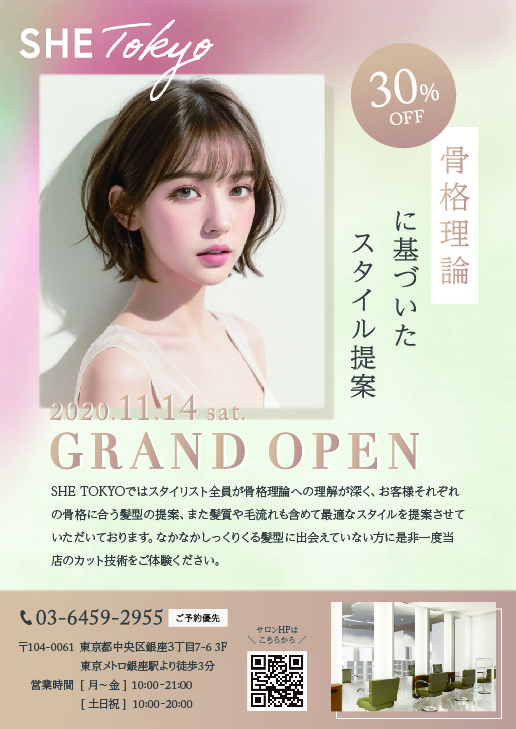 SHElikes MULTI CREATOR CORSEにて、架空美容院OPENの告知をするためのフライヤー制作を行いました。