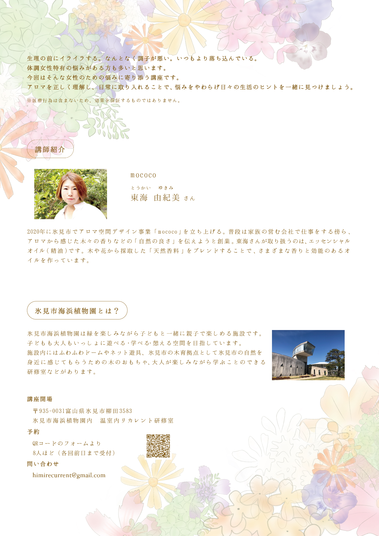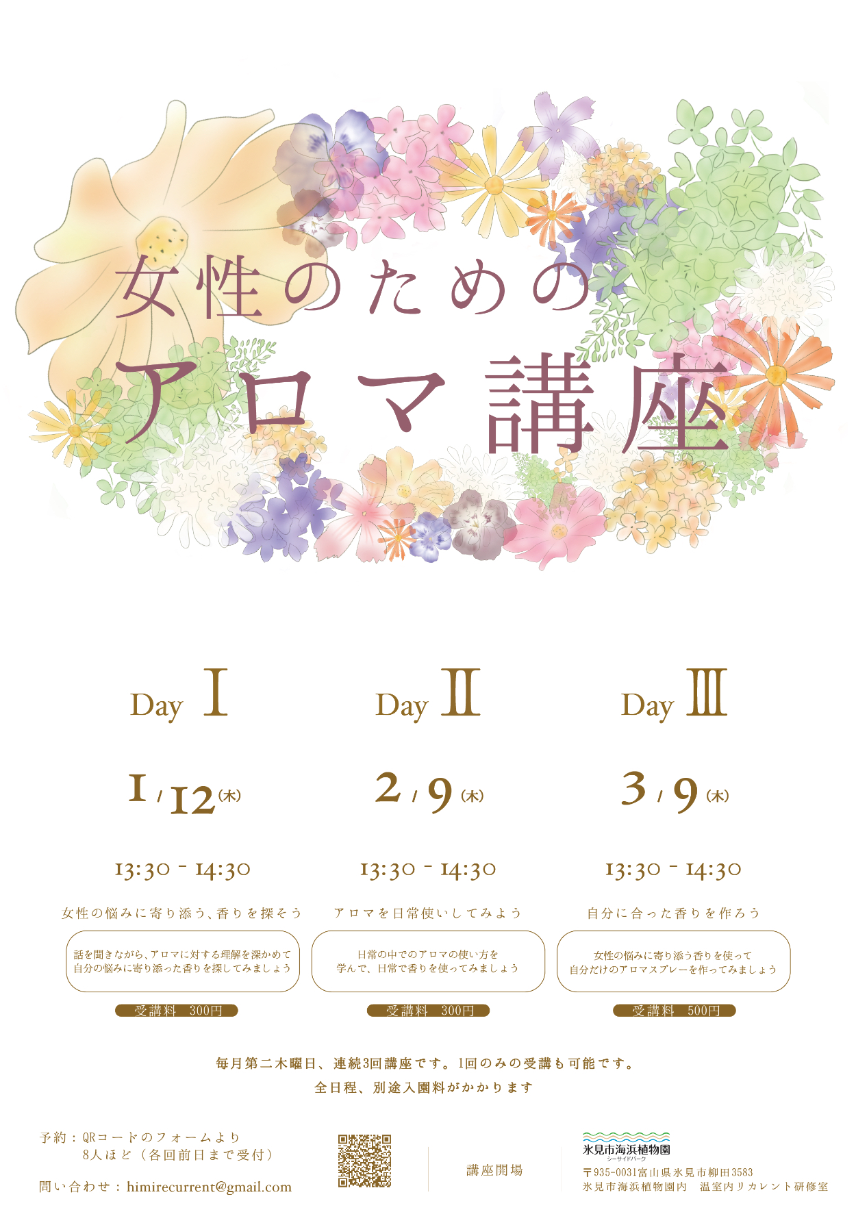 2023年1月12日(木)、2月9日(木)、3月9日(木)に氷見市海浜植物園リカレント研修室にて行われた、『女性のためのアロマ講座』のA4フライヤー制作をしました。イラストから制作しました。
