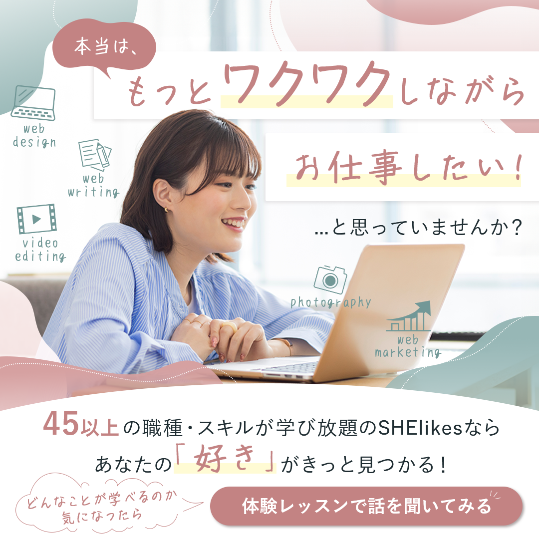 45以上の職種・スキルが学び放題のSHElikesならあなたの“好き”がきっと見つかる!