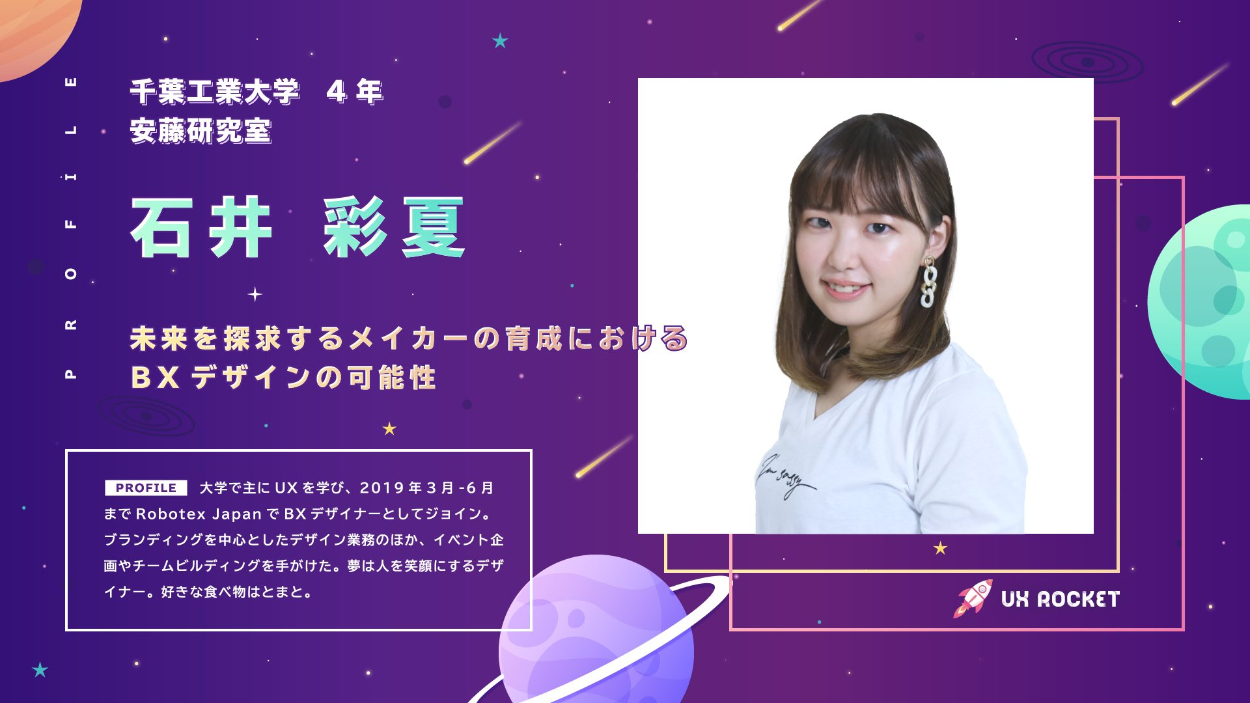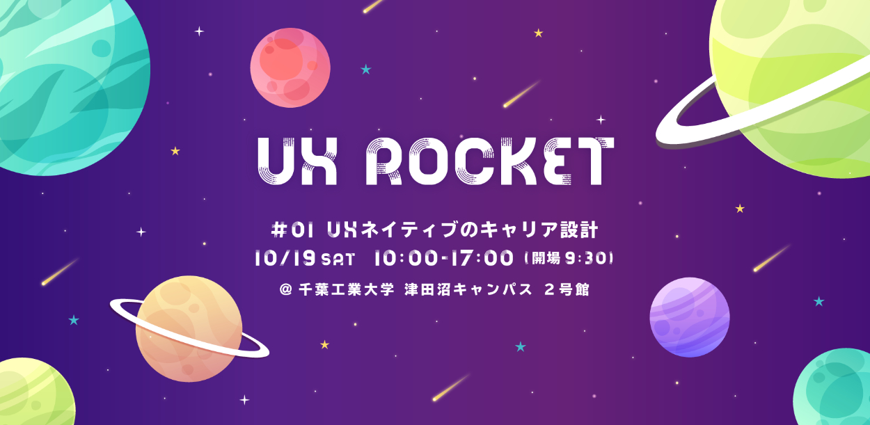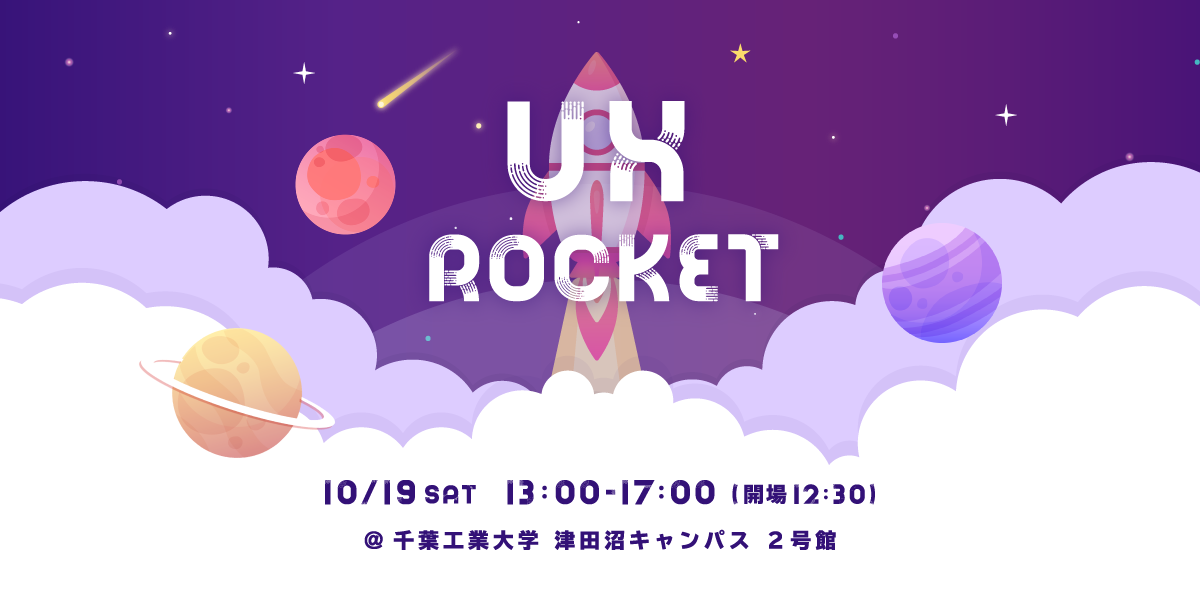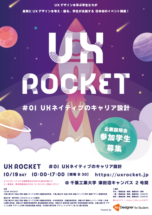 UX ROCKET アートディレクション ishii_ayaka UI/UX デザイナー OVERVIEW UXを学ぶ学生「UXネイティブ」たちによる展示会・講演会のディレクションを株式会社Goodpatchさんと一緒に行いました。 YEAR 2019 メインビジュアルポスターデザインバナーデザインWebサイト