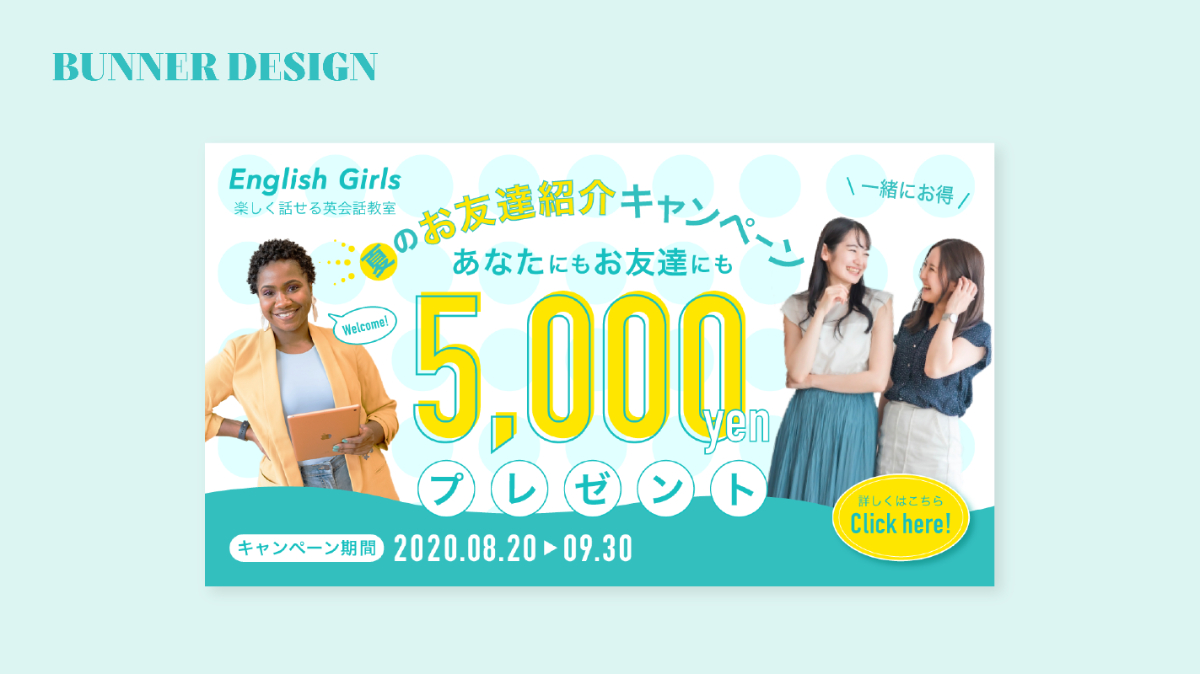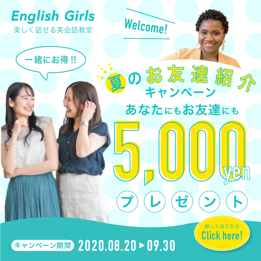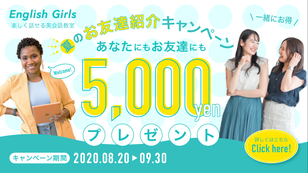 「5,000yen」の文字で目を引き、「英会話教室」→「お友達紹介キャンペーン」→