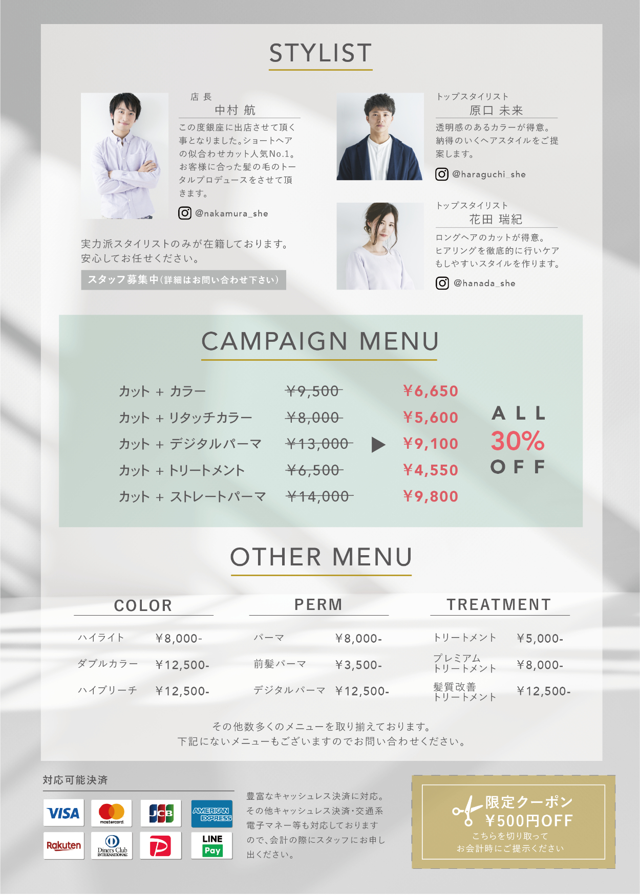 SHElikes MULTI CREATOR PROJECTの課題で、骨格理論に基いたスタイル提案が売りの美容室の特別キャンペーンフライヤー制作に取組みました。(制作時間:15時間)