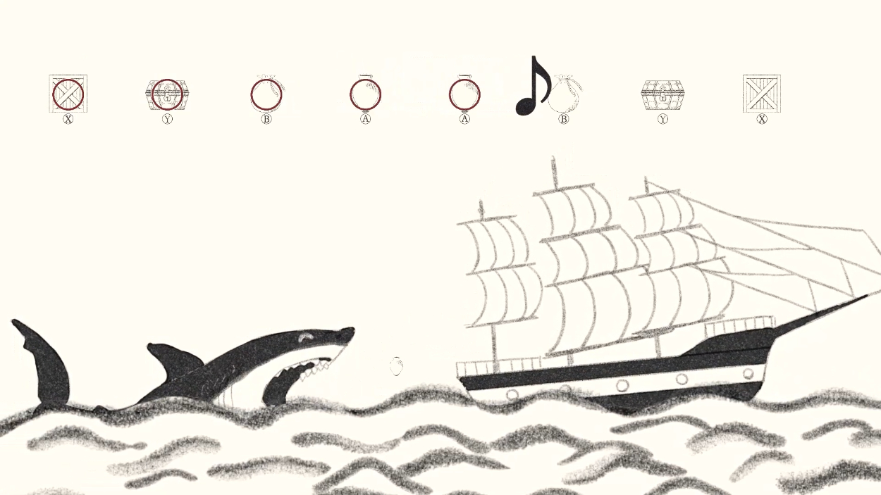 その帆船は、悪食のサメに追われていた── 飢えたサメの要求に応えて、積み荷を船から落としていくリズムゲーム。穏やかなBGMと、絶体絶命の場面が対照的な不思議体験。