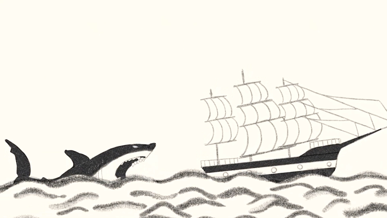 プレイヤーの乗る帆船が、巨大なサメに追われています。絶体絶命のピンチ!