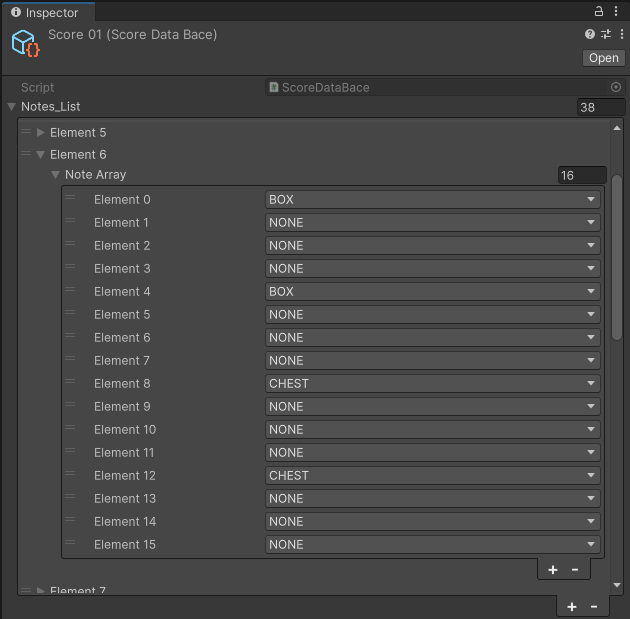 ScriptableObjectを利用して、インスペクターから譜面を設定します。実際の楽譜をもとにプランナーの方がノーツの順番を考えることになったので、16分音符を最小単位として小節を構成し、小節を複数つなげることで譜面を構成するようなデータ形式を設計しました。