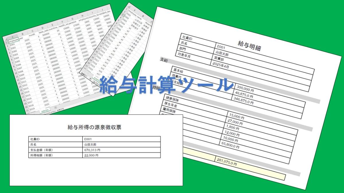 Excel、Pythonを使用して、入力ファイルである「従業員マスタ」、「給与データ」から給与明細、源泉徴収票のPDFを自動で生成するツールを作りました。