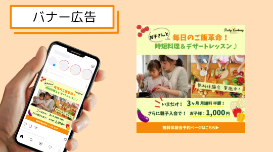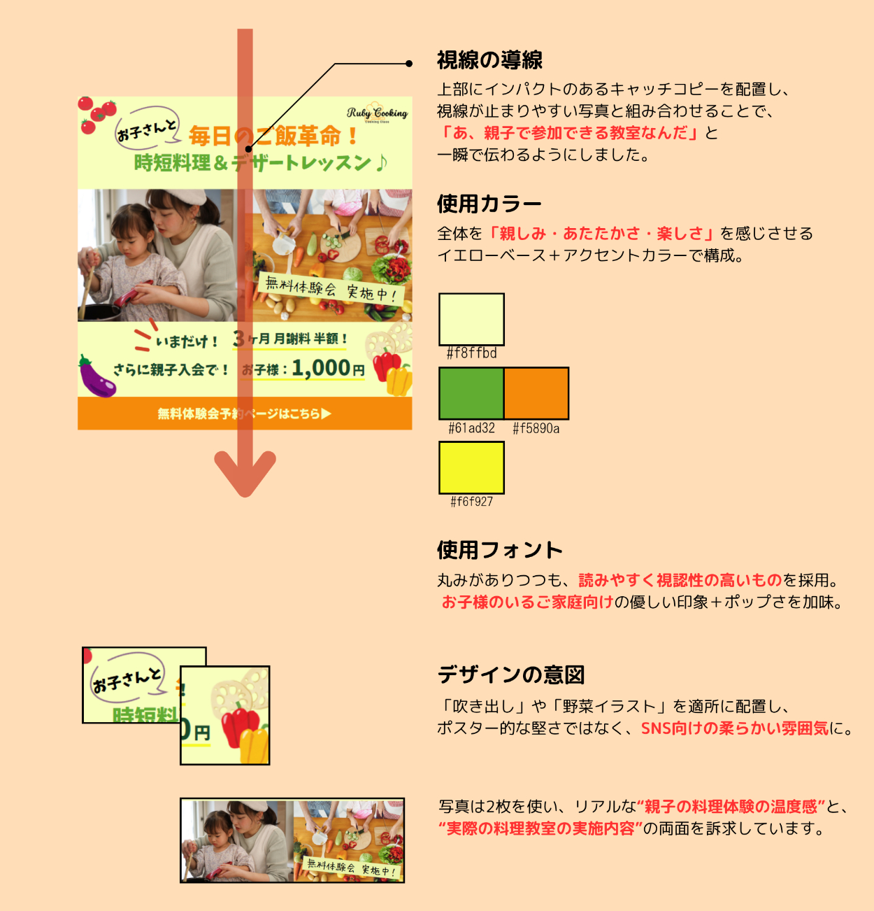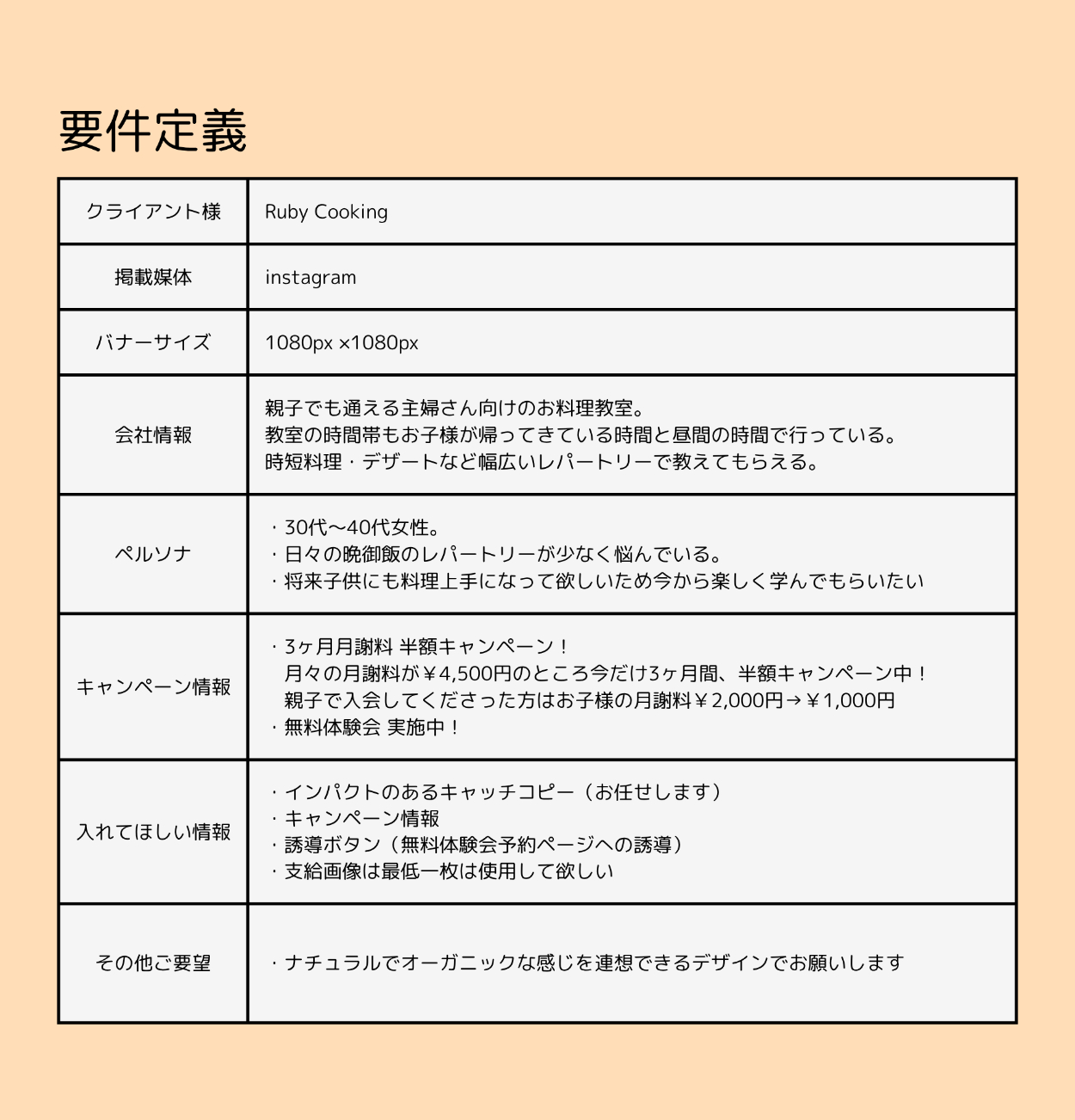 【架空案件】料理教室のバナー広告 ザウルスデザインラボ フリーランスwebデザイナー OVERVIEW Hertechの課題にて、架空案件として料理教室のバナー制作を行いました。 YEAR 2024 使用ツール:Canva作製時間 :3時間