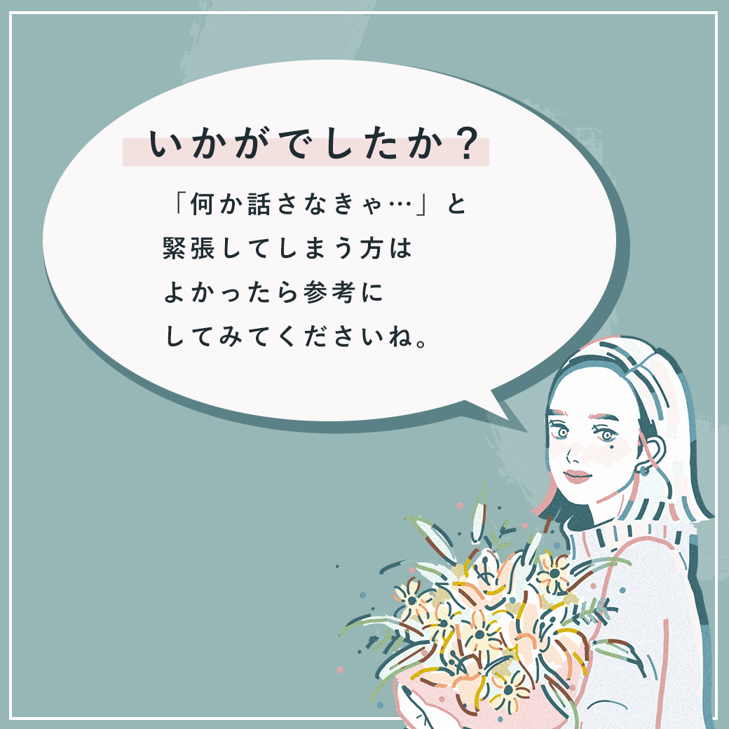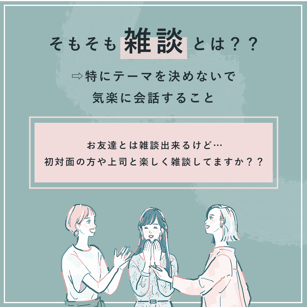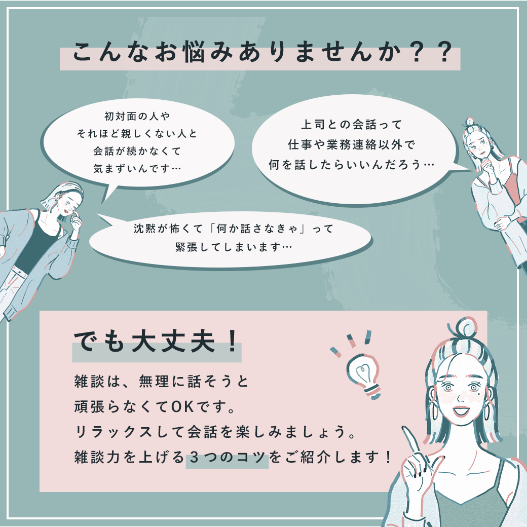 お仕事やライフスタイルに関する情報をお届けしているSHElikes公式インスタグラムの投稿用に作成したものです。内容からレイアウトまで全て自分で考えました。雑談が苦手で悩んでいる方へ少しでもヒントになれば嬉しいな、と思って作成しました。