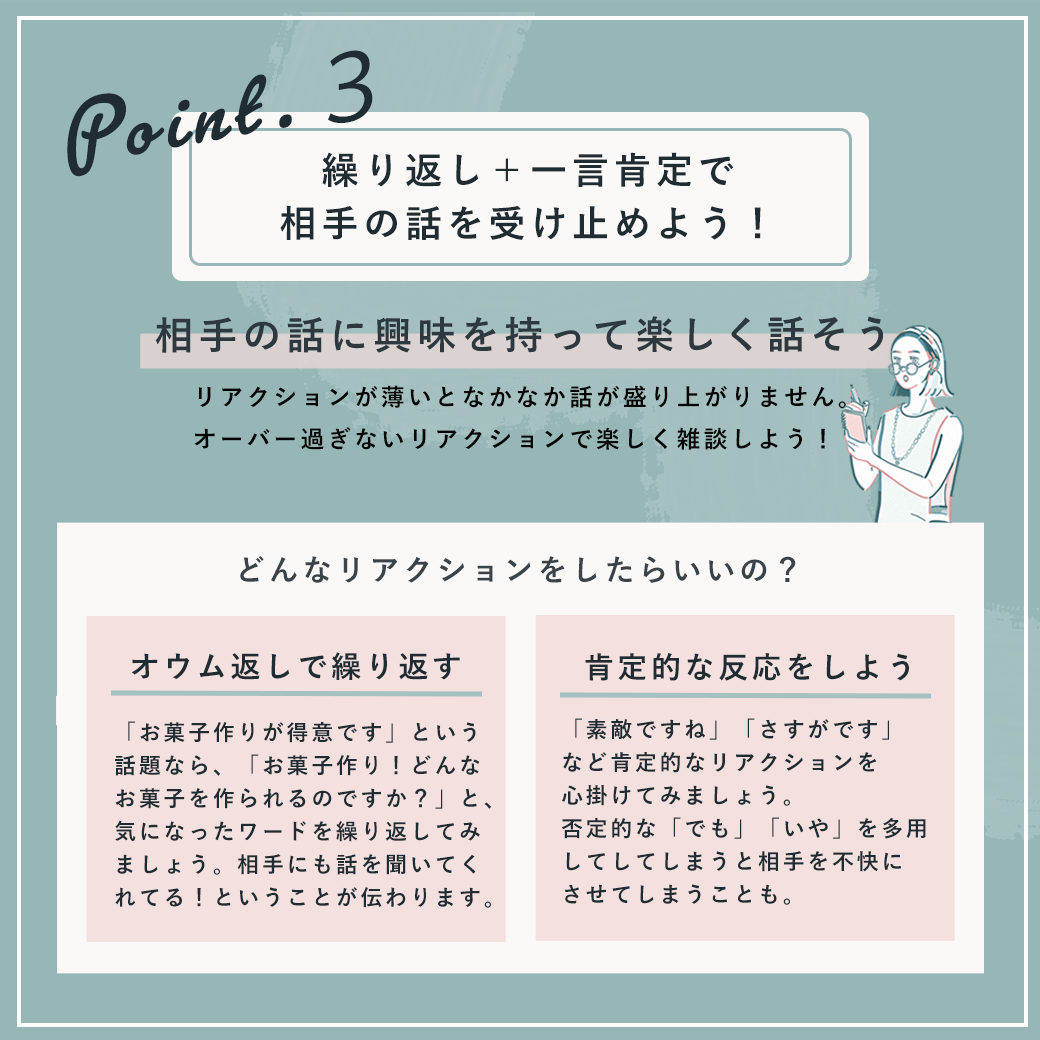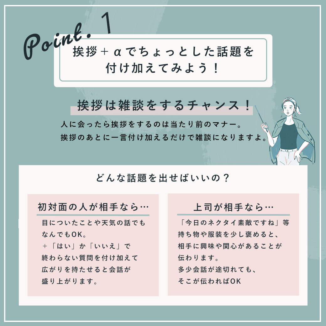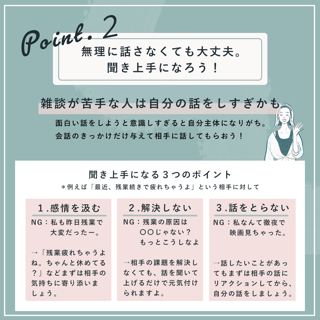 お仕事やライフスタイルに関する情報をお届けしているSHElikes公式インスタグラムの投稿用に作成したものです。内容からレイアウトまで全て自分で考えました。雑談が苦手で悩んでいる方へ少しでもヒントになれば嬉しいな、と思って作成しました。