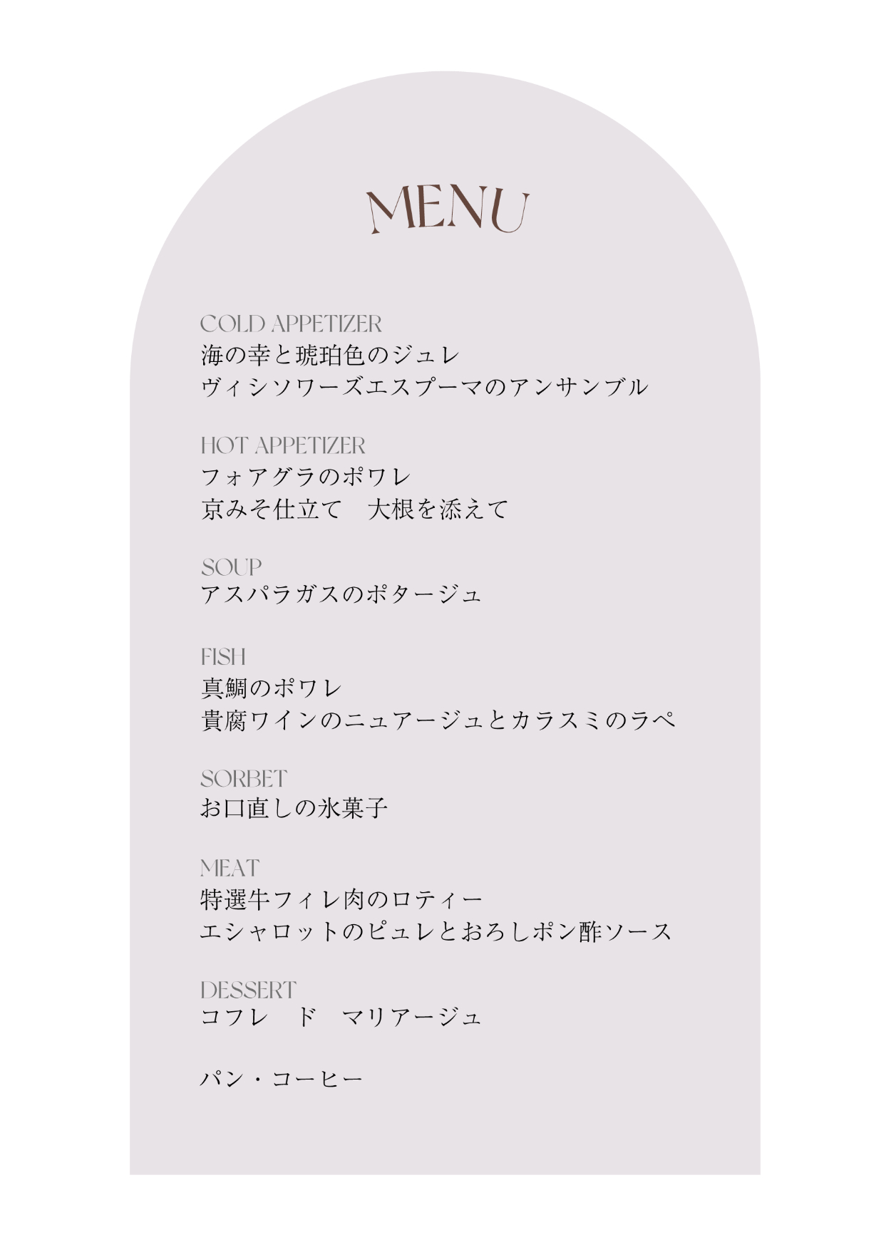 【自主作成】ウエディングペーパーアイテム moeka 複業デザイナー OVERVIEW 自主制作でウエディングペーパーアイテムを作成しました。[制作時間:2時間/使用ツール:illustrator] YEAR 2024 ● 要件定義<制作物> menu表・グリーティングペーパー・席札● デザインのポイントアーチ形・長方形・円形と様々な形のものを作り独自性を出しました。席札は円形で可愛らしくなっています。