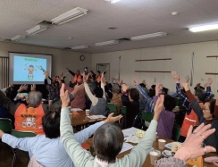 理学療法士:杉浦良介様より。静岡県磐田市で朝・夕流れる音楽に合わせた体操のイラスト。高齢者向けの講演に使用。