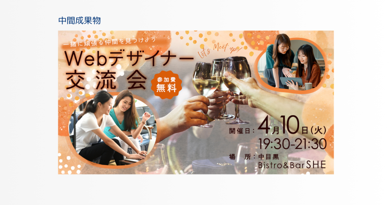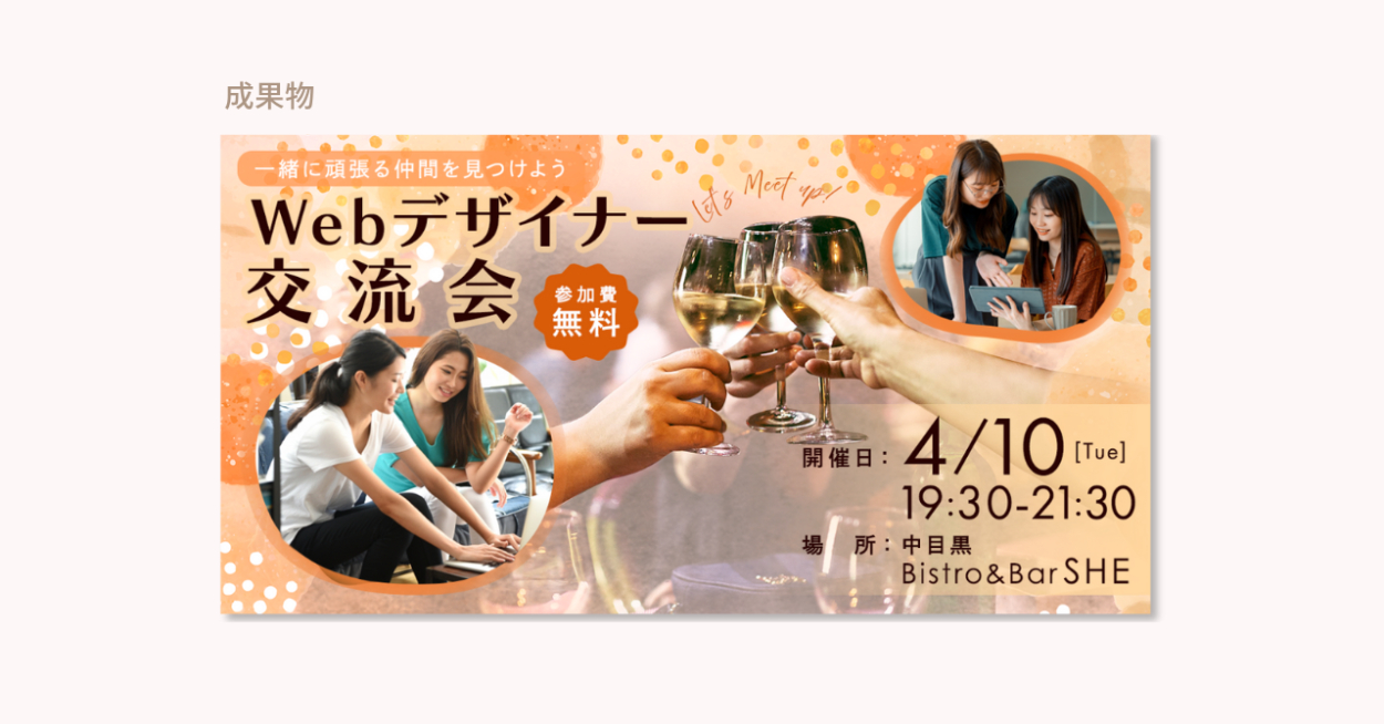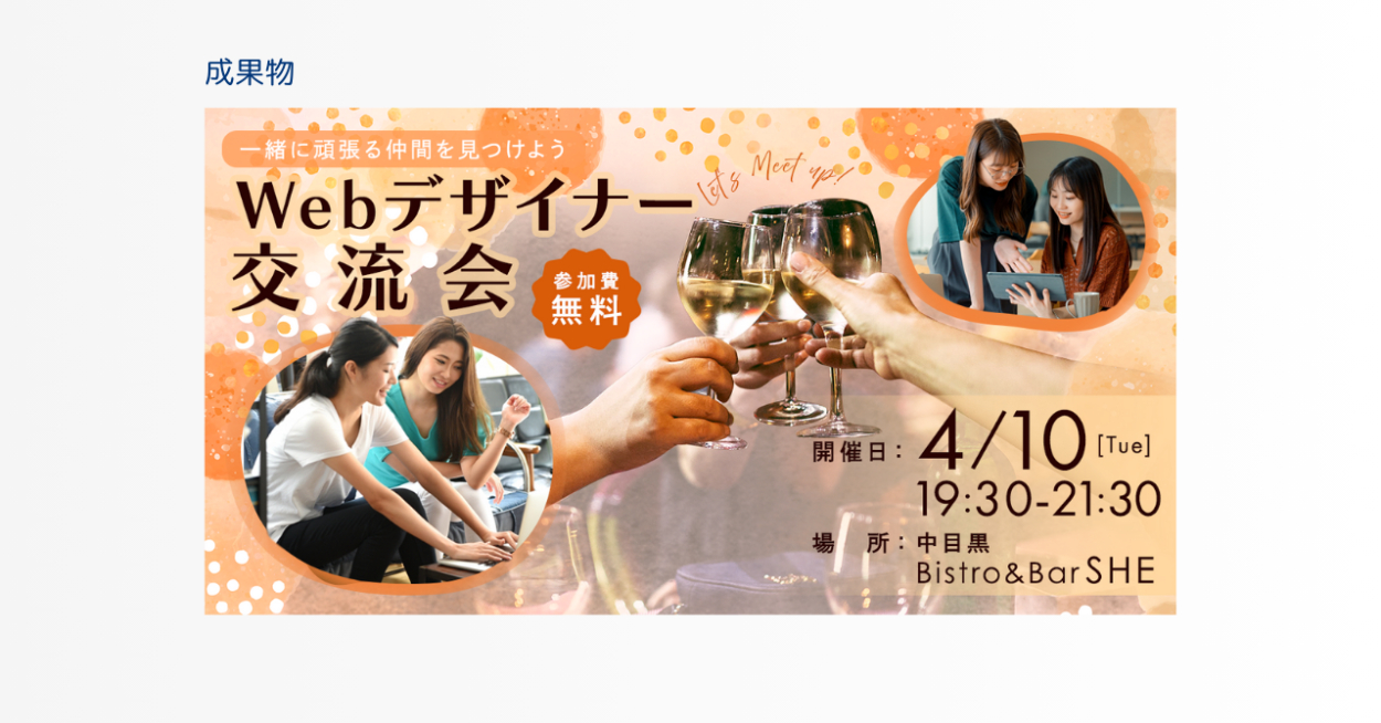 「Webデザイナー交流会」なので「仕事の事を共有する姿」と「楽しんで交流する様子」を入れて同じ業種で交流をするという目的が分かるように画像を選択してレイアウトをした。