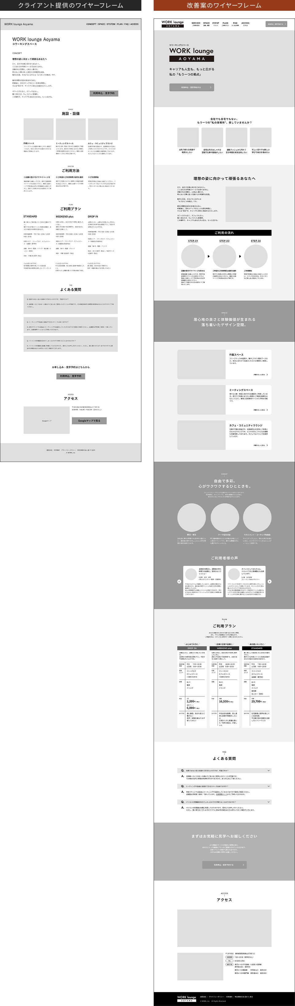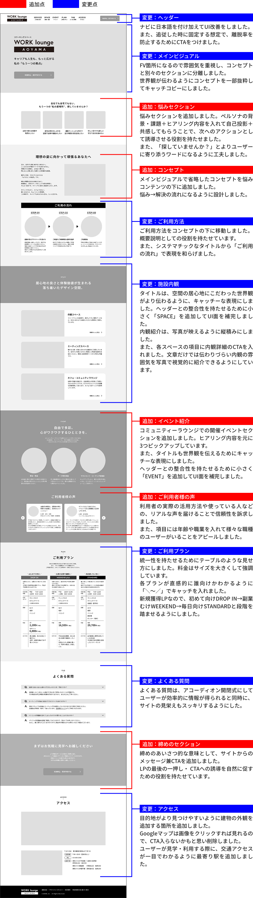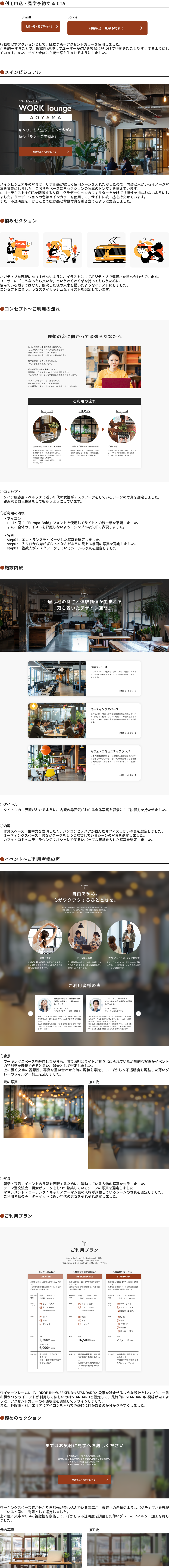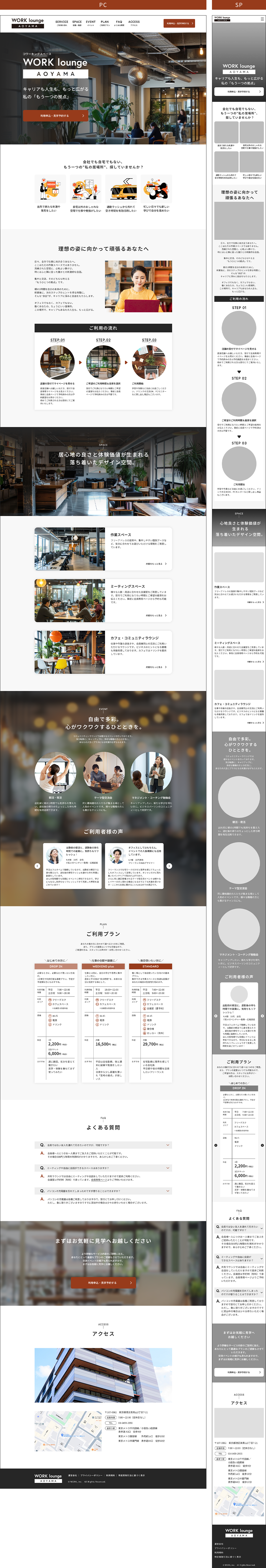 SHElikes PRO デザイナーの実践課題として架空のコワーキングスペースのLP制作に取り組みました。クライアントの要件とワイヤーフレームを元に、ワイヤーフレームの改善案とデザインカンプの制作をしました。