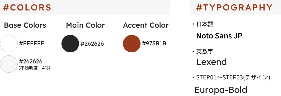今回選定したデザインが写真映えがしやすいのと、落ち着き・大人っぽさがテーマだったので、無彩色ベースのカラーリングにしました。アクセントカラーには木の色に近い茶色にしてデザインとの親和性を持たせました。