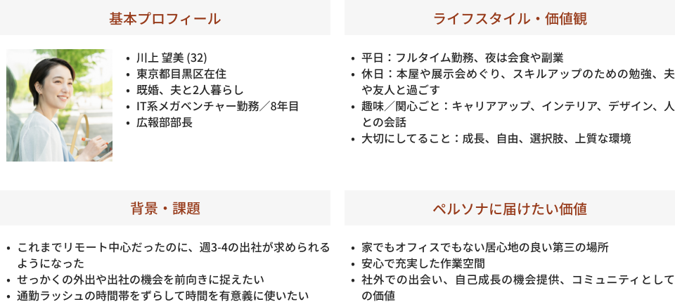 - 都内在住でキャリア志向が強く、外交的で自己成長に積極的なビジネスパーソン