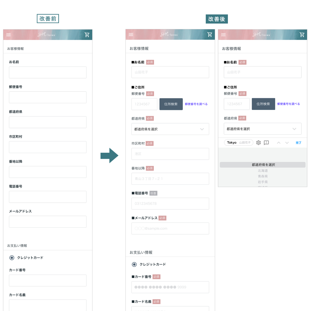 ・入力の手間を省くために、郵便番号を入力すると自動で住所が 反映される仕組みを用 意する