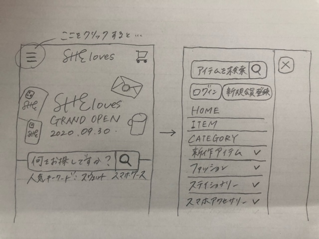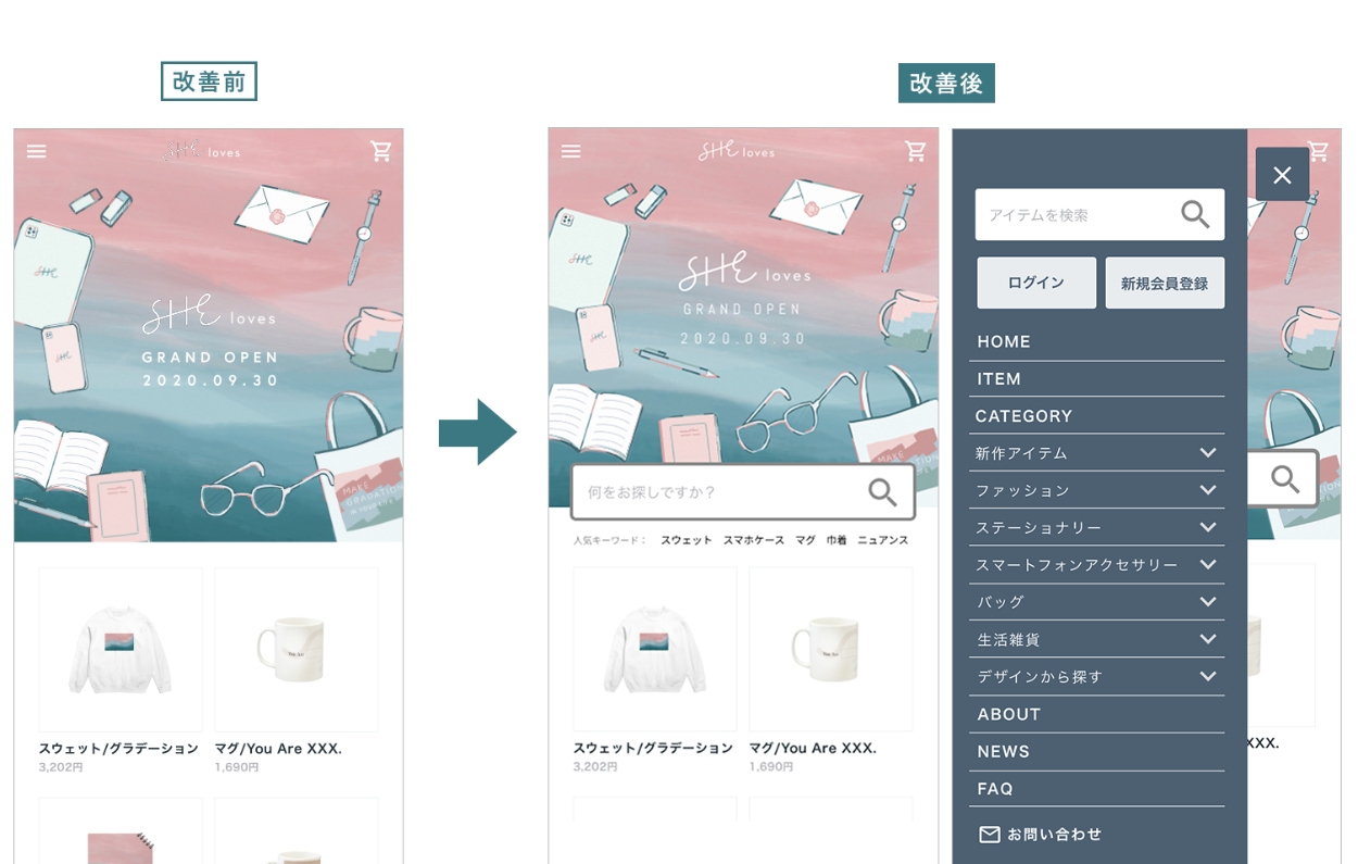 商品がカテゴリ分けされておらず、例えばユーザーが「このサイトで販売されているメモ帳の商品 一覧を見ながら購入商品を選びたい」と考えた時に見るべきページが存在せず利便性が低下。 結局、欲しい商品を見つけることができず、途中で離脱してしまう。