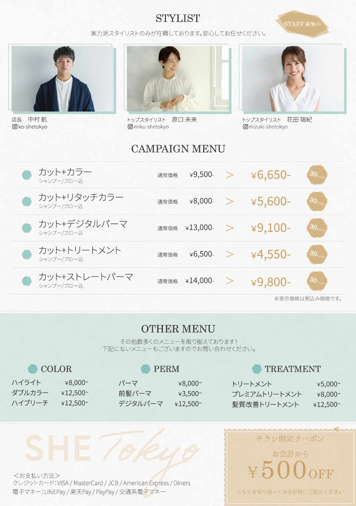 ②表面はメインビジュアルや、店舗写真でビジュアルでお店の雰囲気を伝えているので、その流れで裏面上部にスタイリスト情報を配置し、情報の統一感を意識しました。