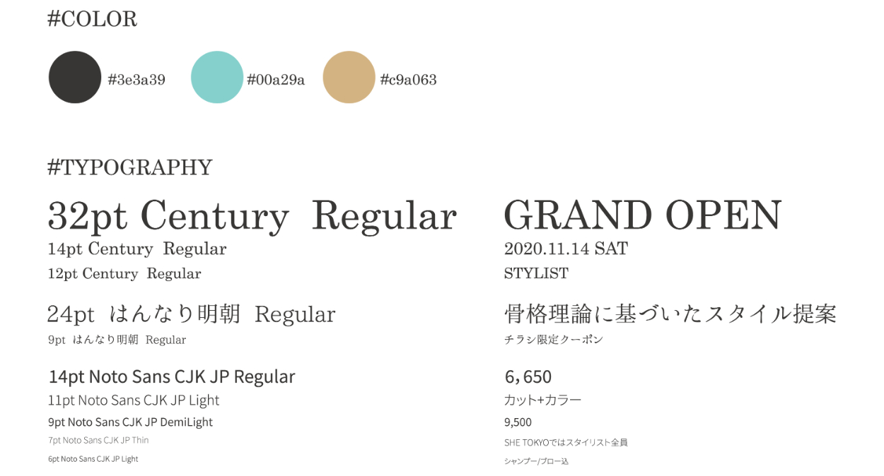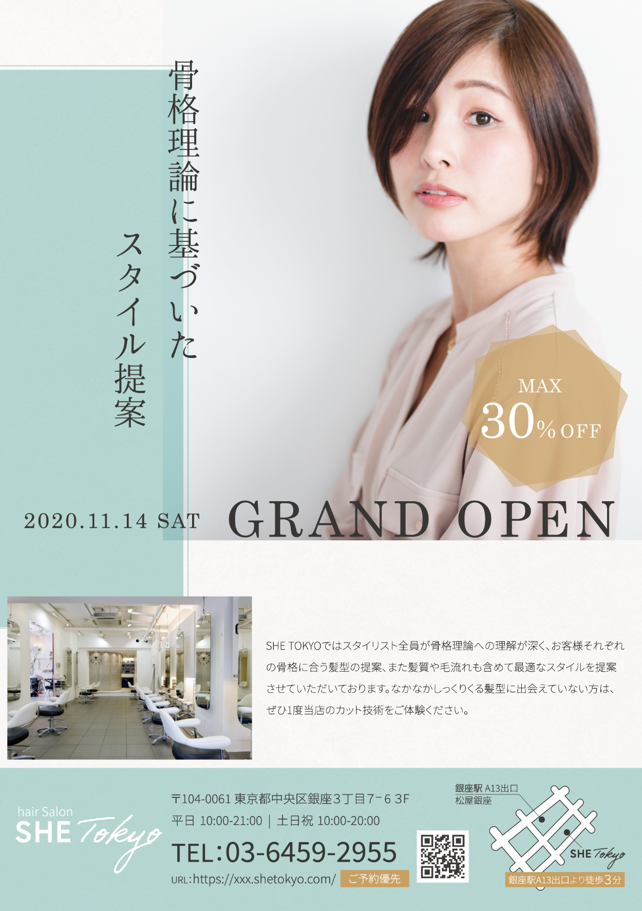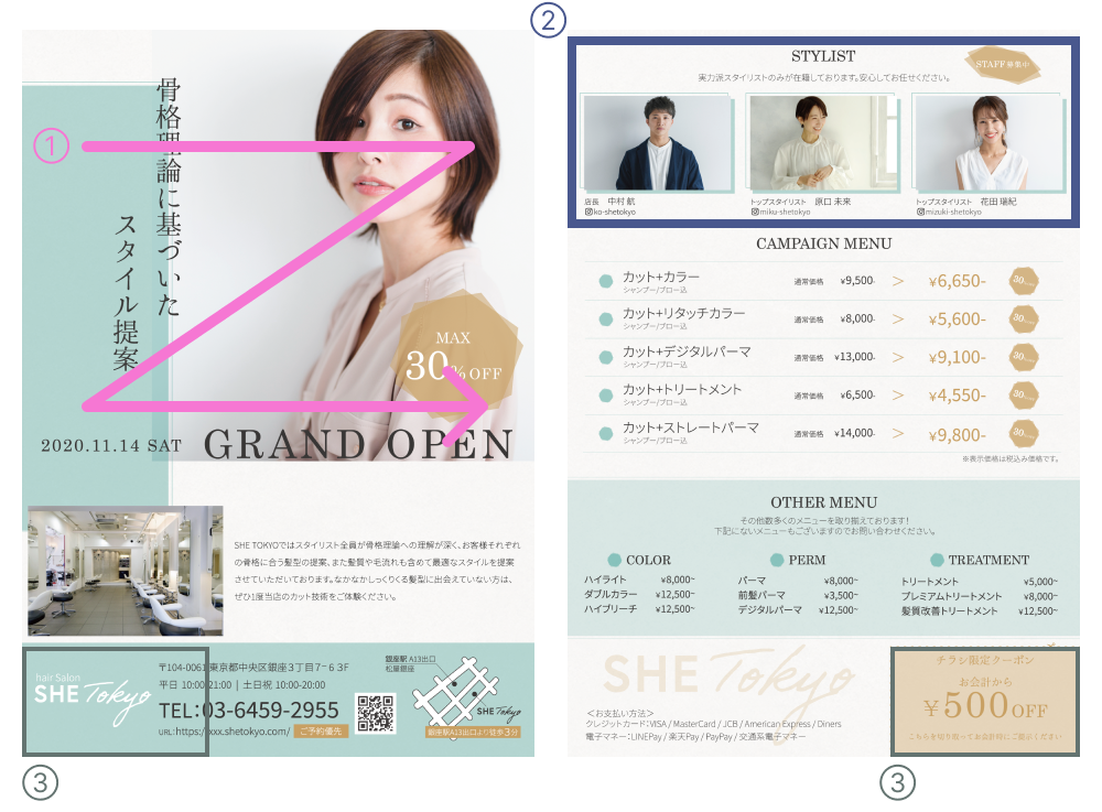 ①キャッチフレーズ「骨格理論に基づいたスタイル提案」→メインビジュアル→日時「2020.11.14 SAT GRAND OPEN」→「30%OFF」とZの視線誘導を意識して配置しました。